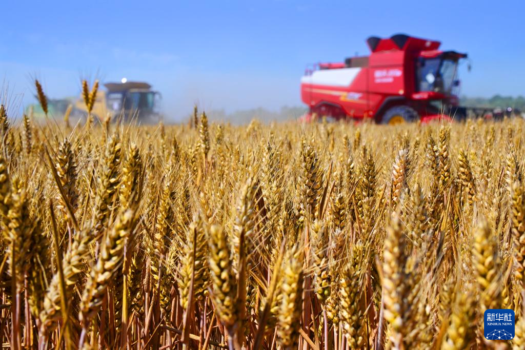 6月12日,在青岛西海岸新区大场镇的麦田里,联合收割机在收割小麦。新华社记者 李紫恒 摄