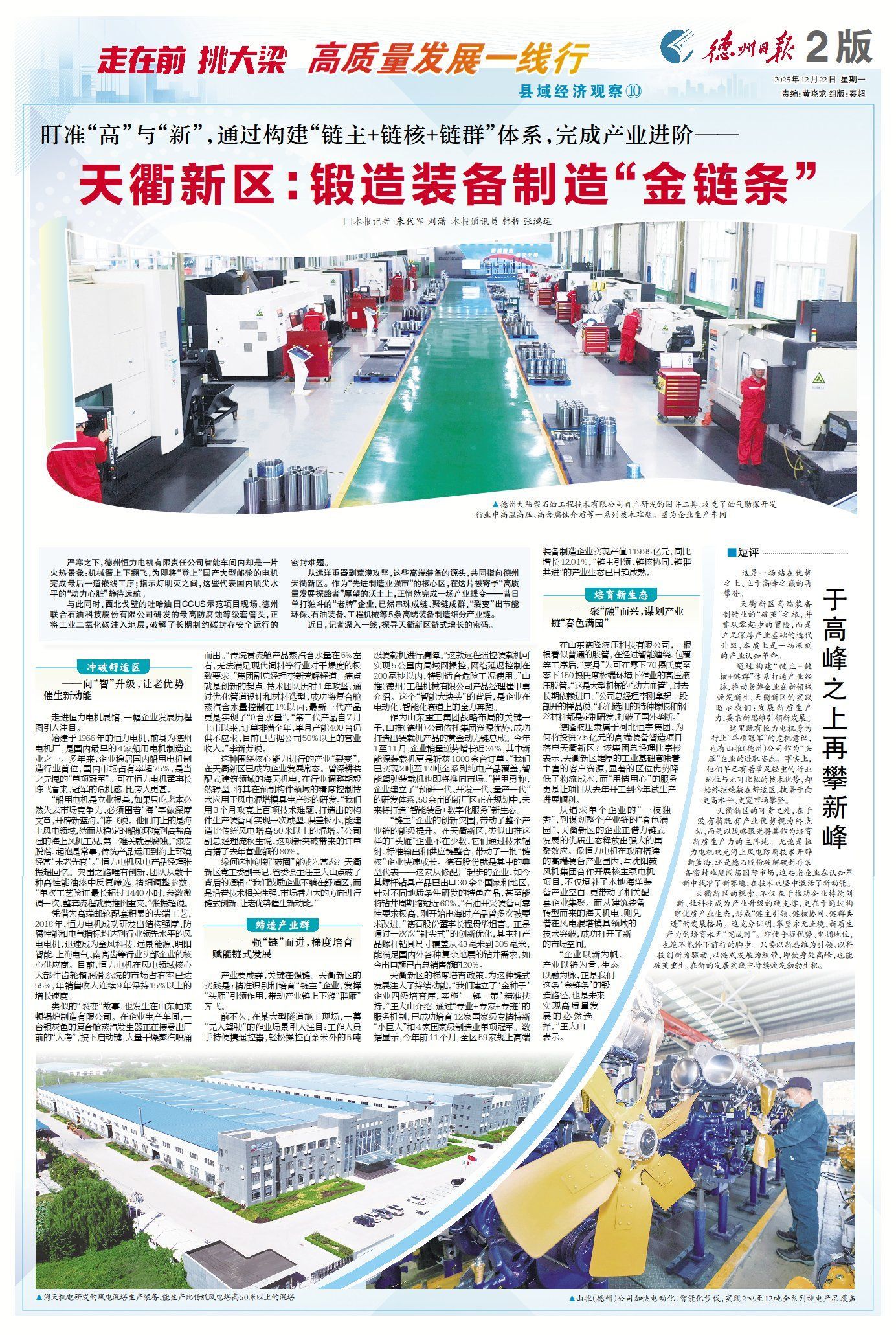 从远洋重器到荒漠攻坚,这些高端装备的源头,共同指向德州天衢新区。作为“先进制造业强市”的核心区,在这片被寄予“高质量发展探路者”厚望的沃土上,正悄然完成一场产业蝶变——昔日单打独斗的“老牌”企业,已然串珠成链、聚链成群,“裂变”出节能环保、石油装备、工程机械等5条高端装备制造细分产业链。