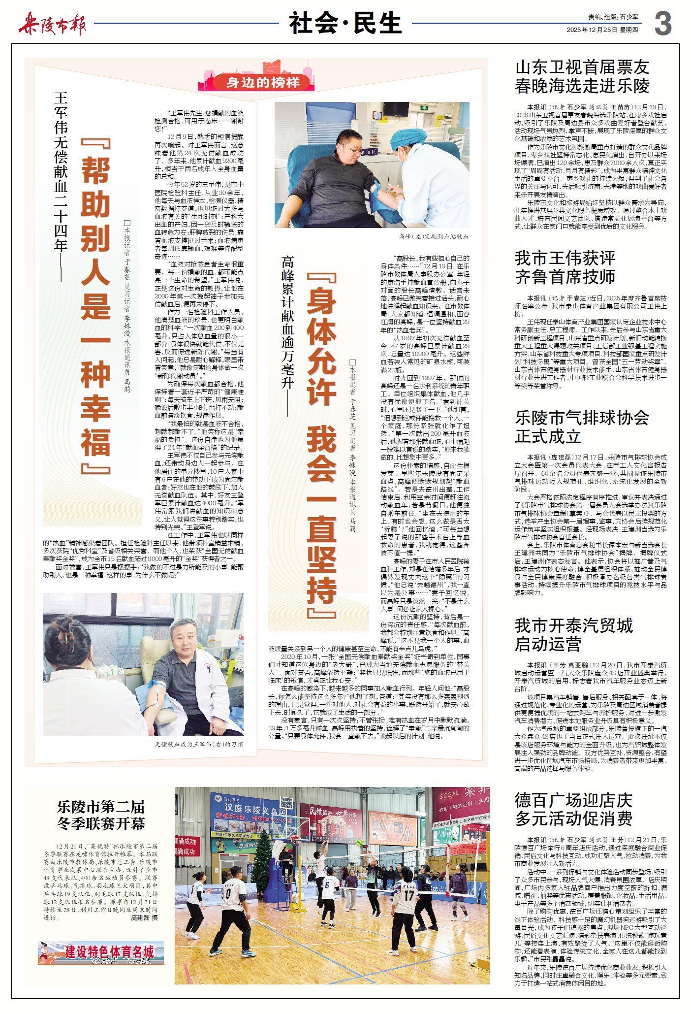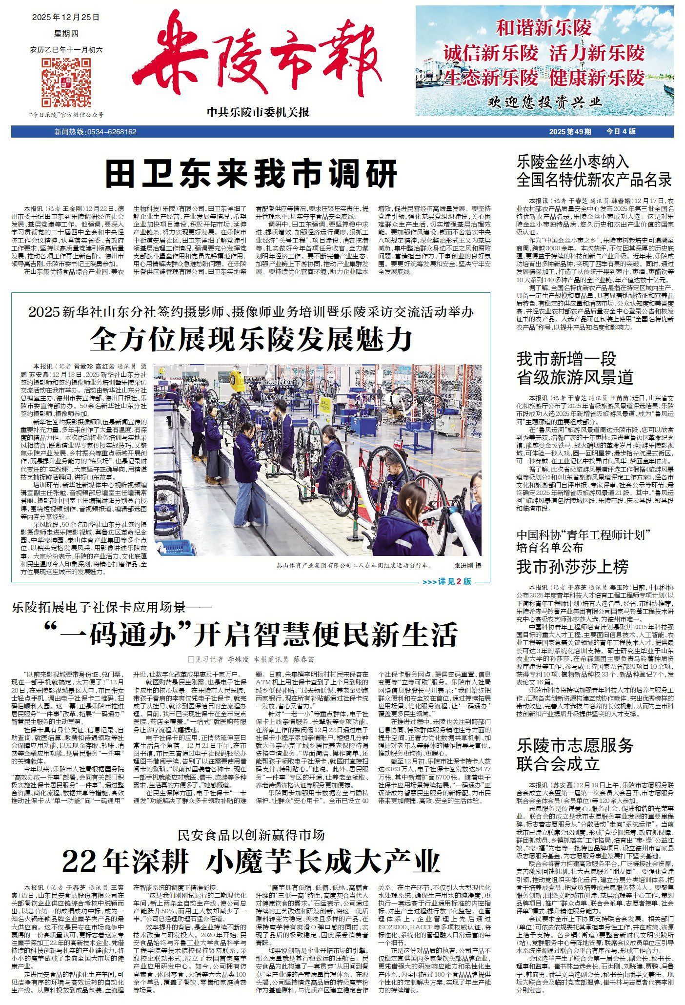 乐陵市新闻周报(12月19日至12月25日) ©原创 2025-12-25 07:41 德州日报 0 ▶乐陵: “一码通办”开启智慧便民新生活(点击查看详情) ▶民安食品:22年深耕 小魔芋长成大产业(点击查看详情) ▶乐陵市以商会带动产业发展,促进企业合作共赢(点击查看详情) ▶王军伟无偿献血二十四年:帮助别人是一种幸福(点击查看详情) ▶高峰累计献血逾万毫升:身体允许,我会一直坚持(点击查看详情) ▶镜观枣乡新韵 定格乐陵活力 | 2025新华社山东分社签约摄影师、摄像师乐陵采访活动剪影(点击查看详情) 德州日报新媒体出品编辑|于春芝审核|胥爱珍 终审|尹滨 (作者:德州日报)