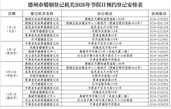 附件:德州市婚姻登记机关2026年节假日预约登记安排表