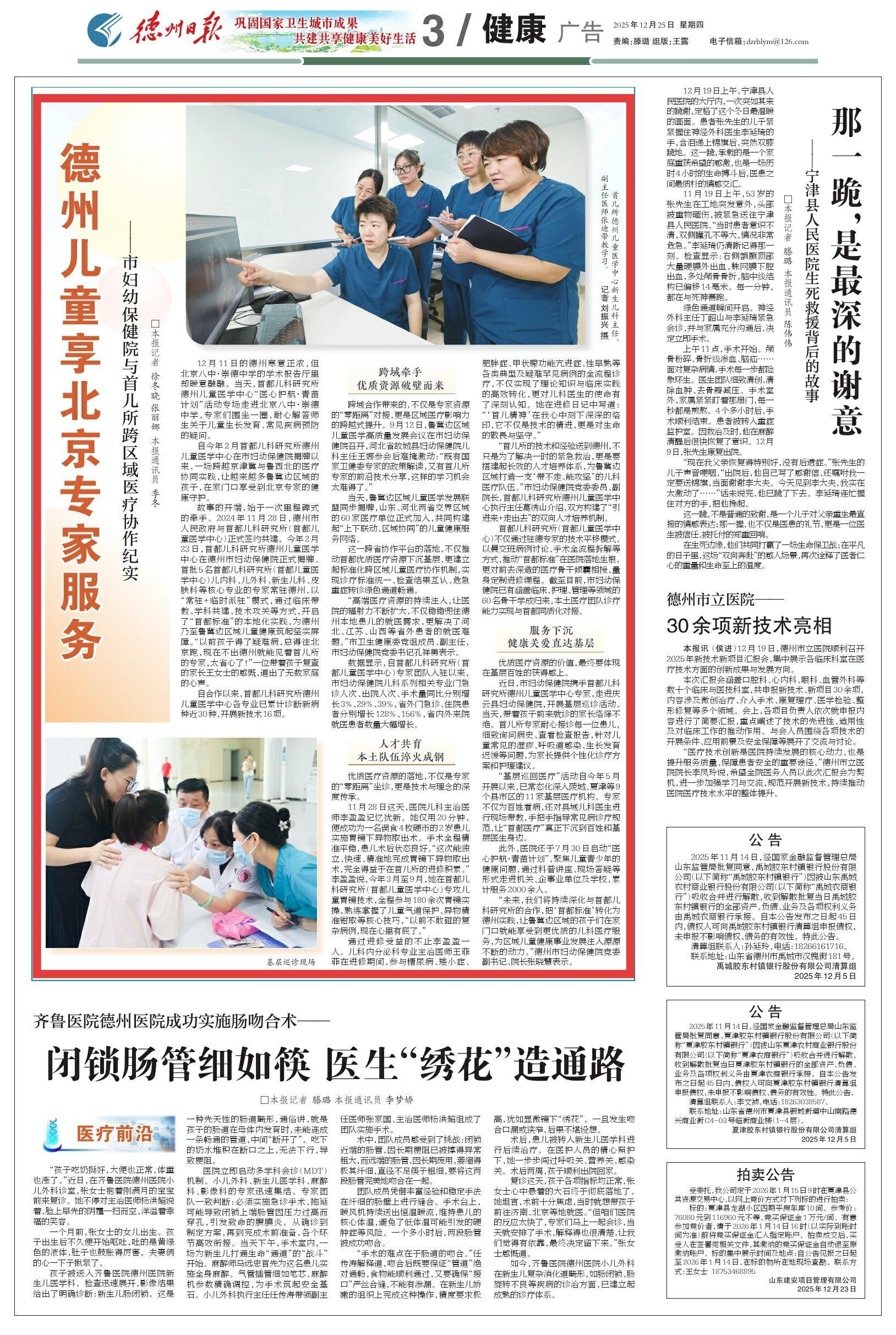 “高端医疗资源的持续注入,让医院的辐射力不断扩大,不仅稳稳兜住德州本地患儿的就医需求,更解决了河北、江苏、山西等省外患者的就医难题。”市卫生健康委党组成员、副主任,市妇幼保健院党委书记孔祥勇表示。