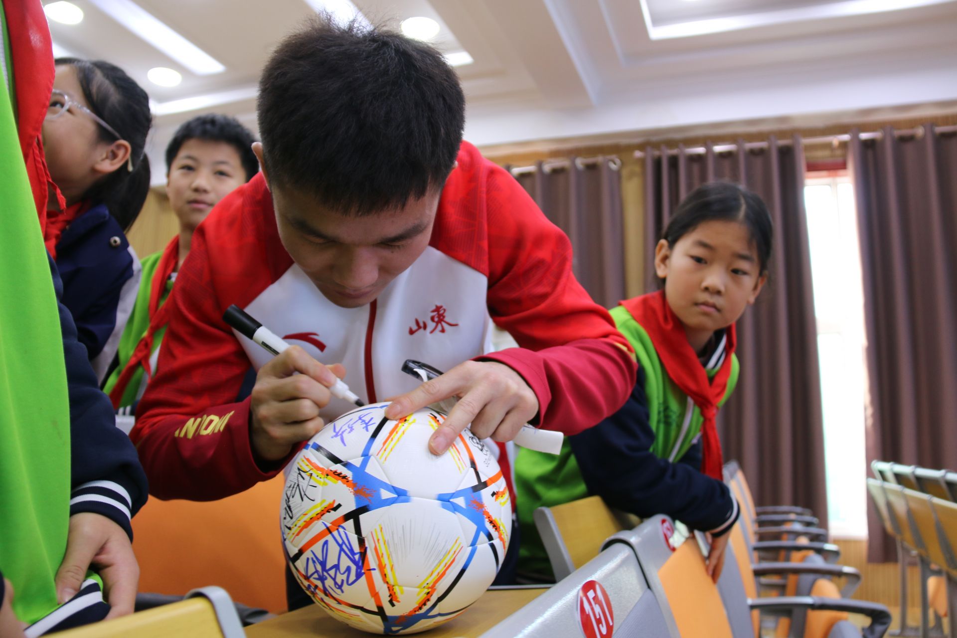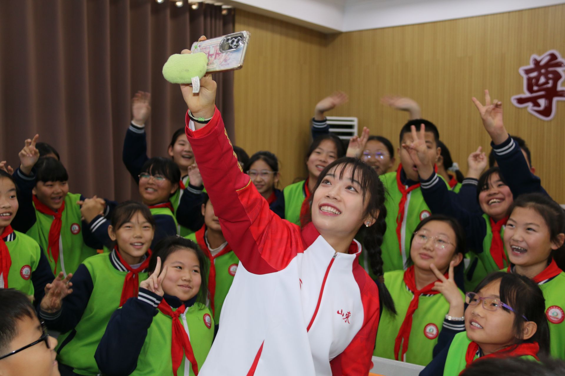 签名环节,学生们围拢在运动员身边,争相邀请签名并合影留念。