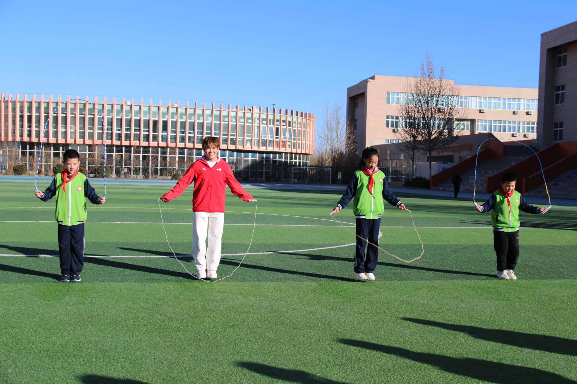 武城县第五实验小学的体育公开课上,运动员分组指导武术散打、田径等基础训练,与学生开展跳绳比赛等互动。