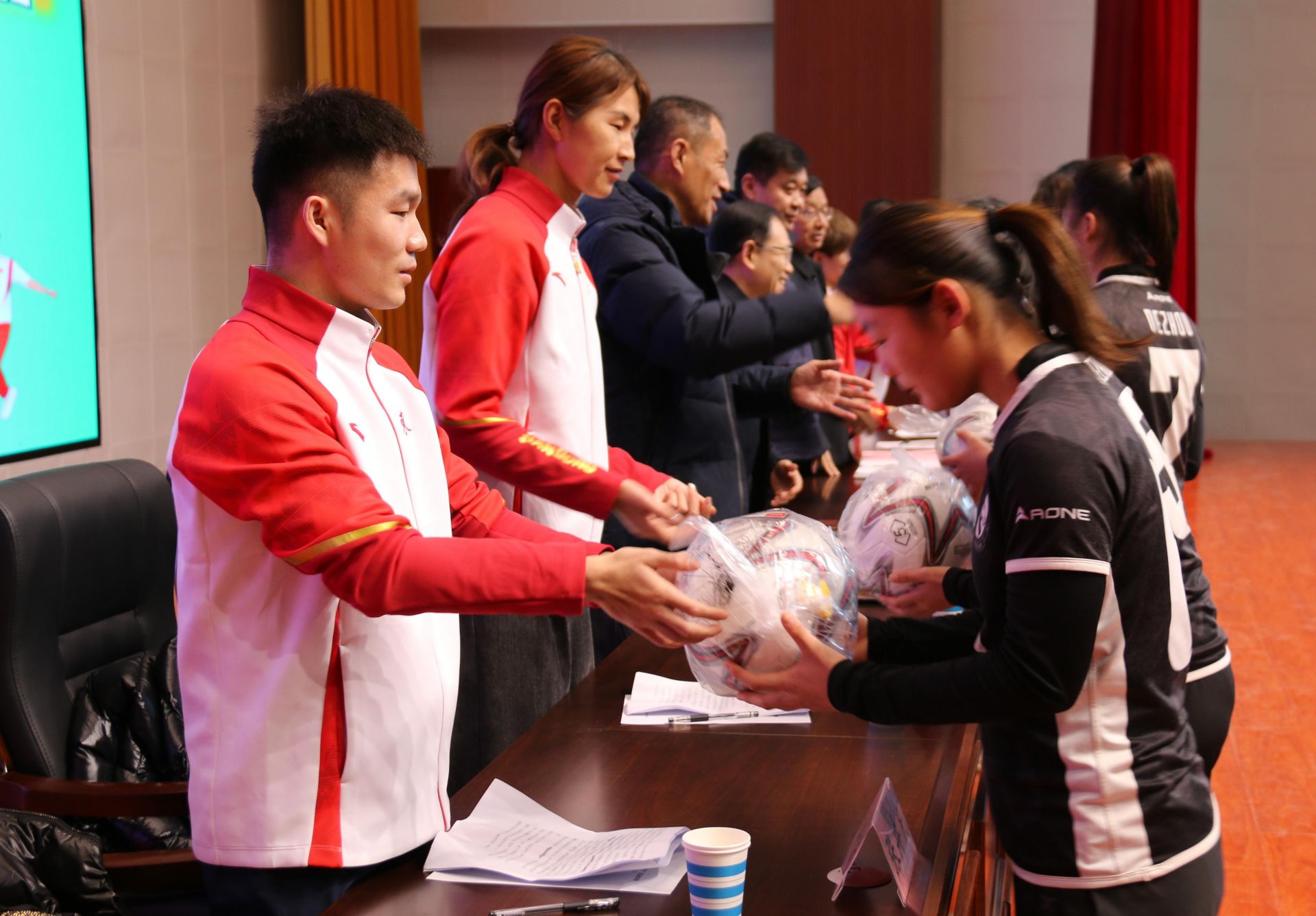 来到德州市体育运动学校,4位运动员逐一分享经验,他们用朴实的语言讲述奋斗故事,传递“永不言弃、勇攀高峰”的体育精神。随后,运动员们与相关领导一同为市体校捐赠足球、篮球、排球等体育用品,助力学校体育教学与训练。