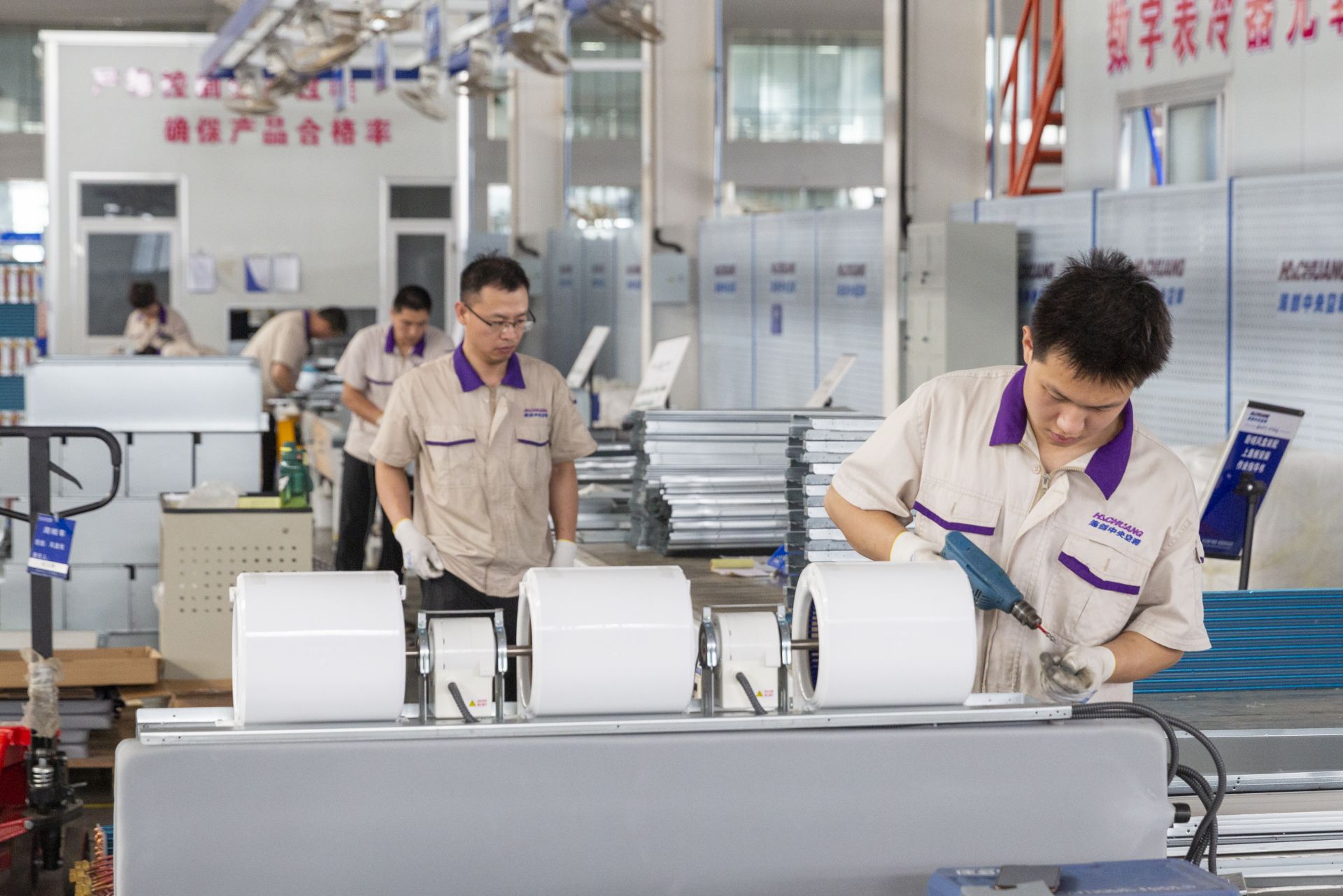 海创集团是该镇乃至全县暖通空调产业的“龙头”。企业的数字化智能化程度高达78%,一个人就可以管理2条生产线、控制10台自动冲压设备。集团运营总监尹兴华介绍,前不久,集团生产的一批超低温空气源热泵出口东南亚,从订单签订到产品出口仅用15天时间。