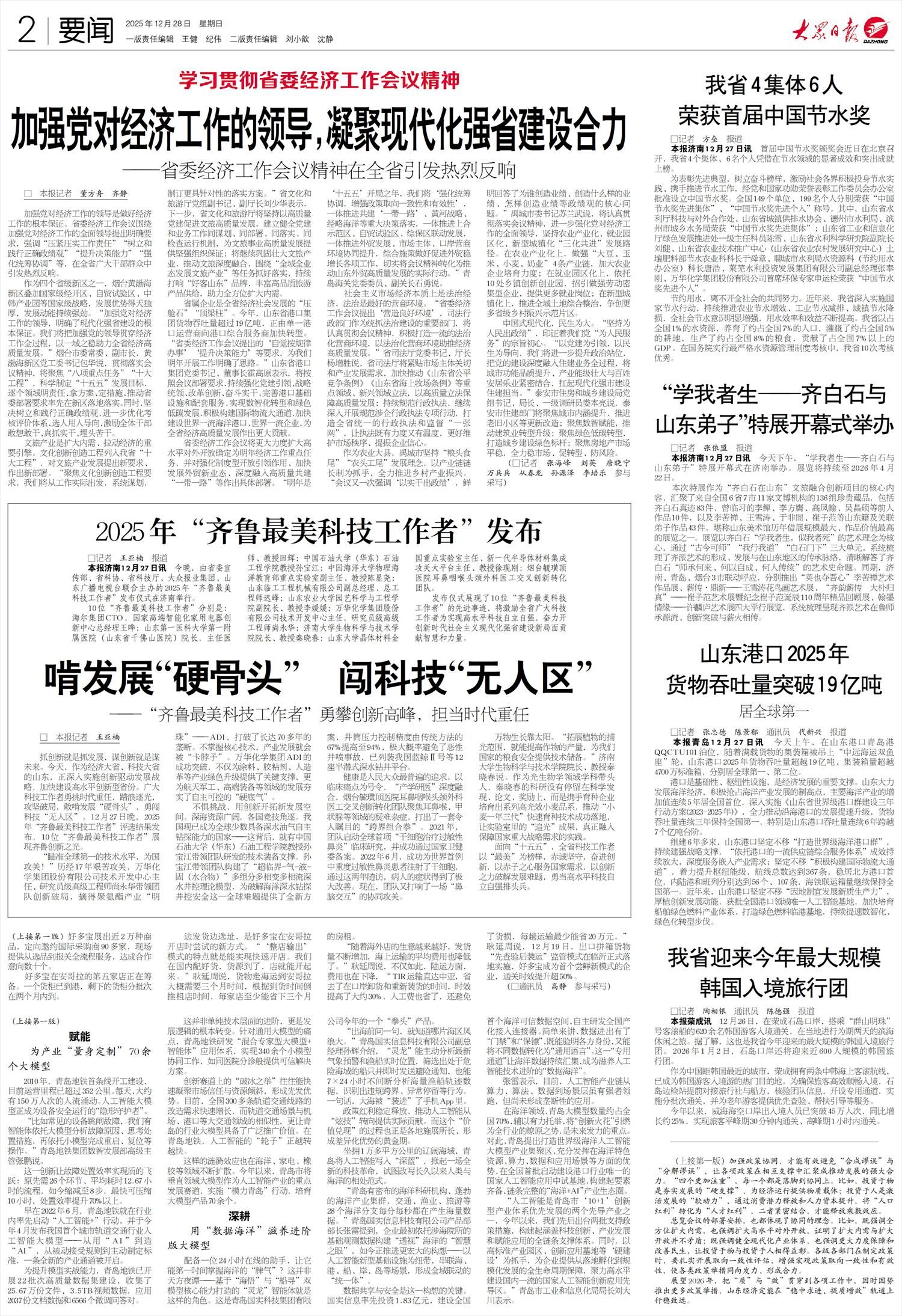 作为四个省级新区之一,烟台黄渤海新区叠加国家级经开区、自贸试验区、中韩产业园等国家级战略,发展优势得天独厚,发展动能持续强劲。“加强党对经济工作的领导,明确了现代化强省建设的根本保证。我们将把加强党的领导贯穿经济工作全过程,以一域之稳助力全省经济高质量发展。”烟台市委常委、副市长,黄渤海新区党工委书记包华说,贯彻落实会议精神,将聚焦“八项重点任务”“十大工程”,科学制定“十五五”发展目标,逐个领域明责任、拿方案、定措施,推动省委部署要求率先在新区落地落实。同时,坚决树立和践行正确政绩观,进一步优化考核评价体系、选人用人导向,激励全体干部敢想敢干、真抓实干、埋头苦干。