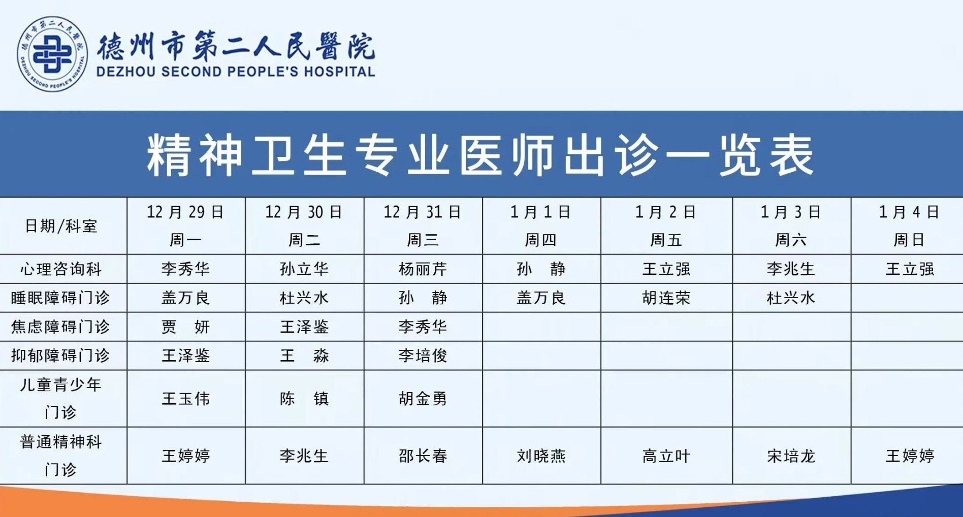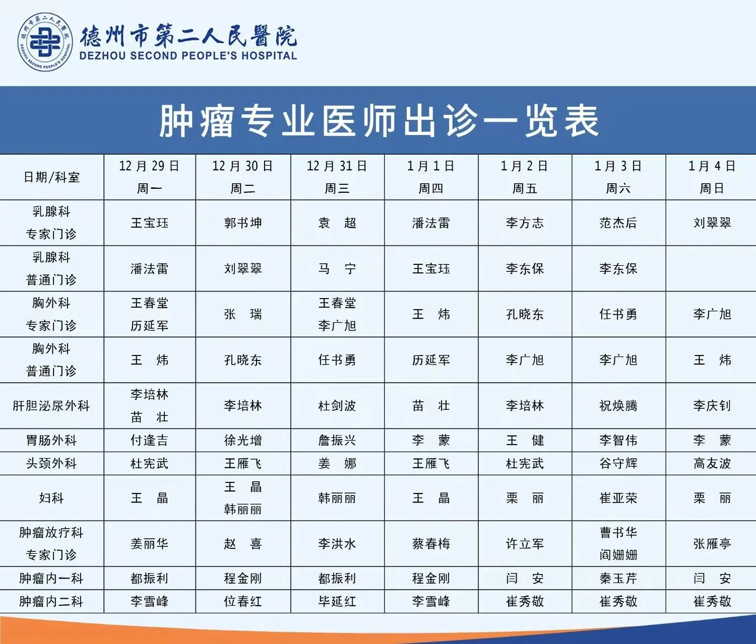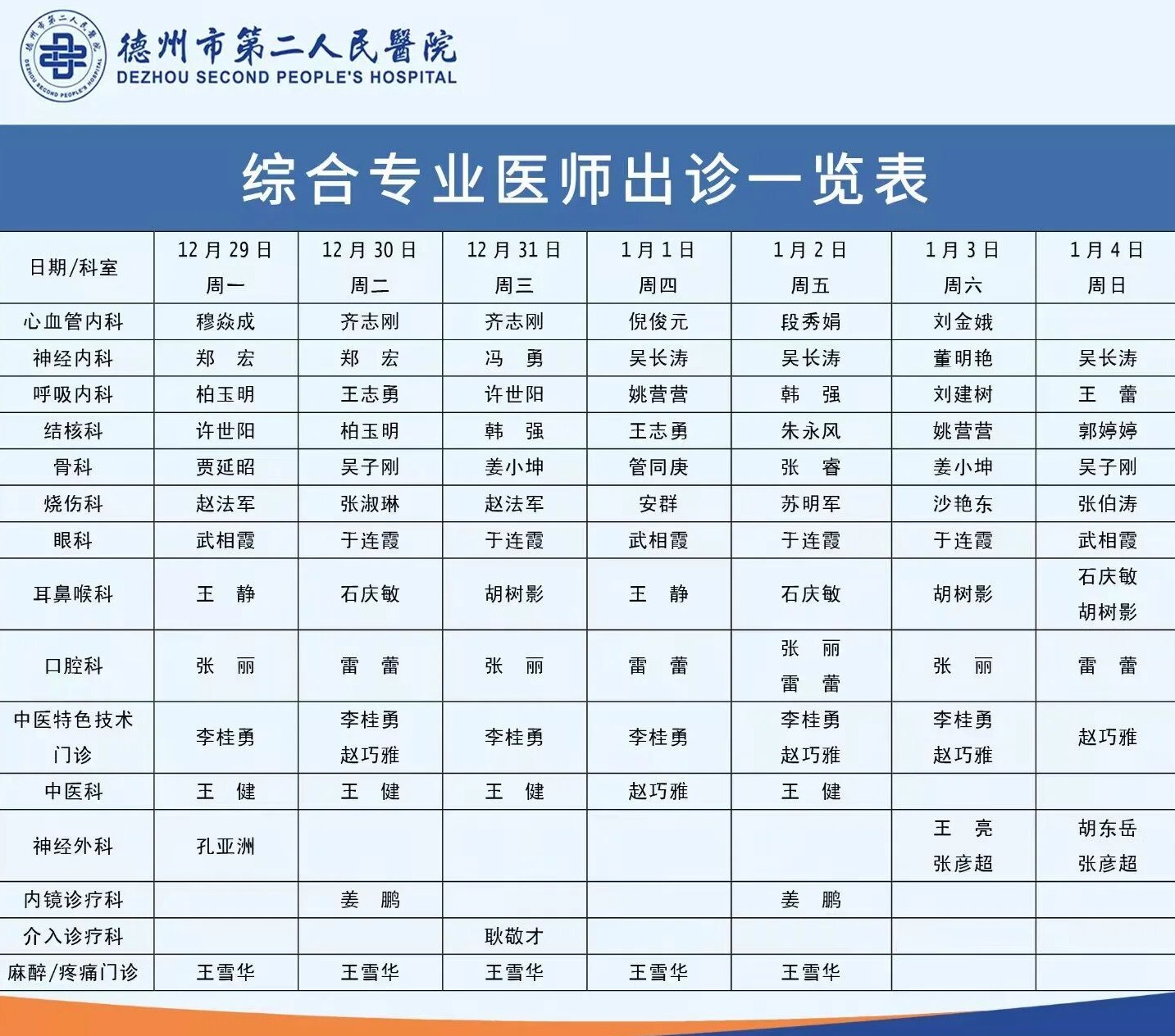 为方便广大市民朋友们就医,德州市第二人民医院12月29日至1月4日门诊医师出诊表如下。若有变化,以当天出诊安排为准(门诊上班时间为上午8:00至11:30,下午13:30至17:00)。