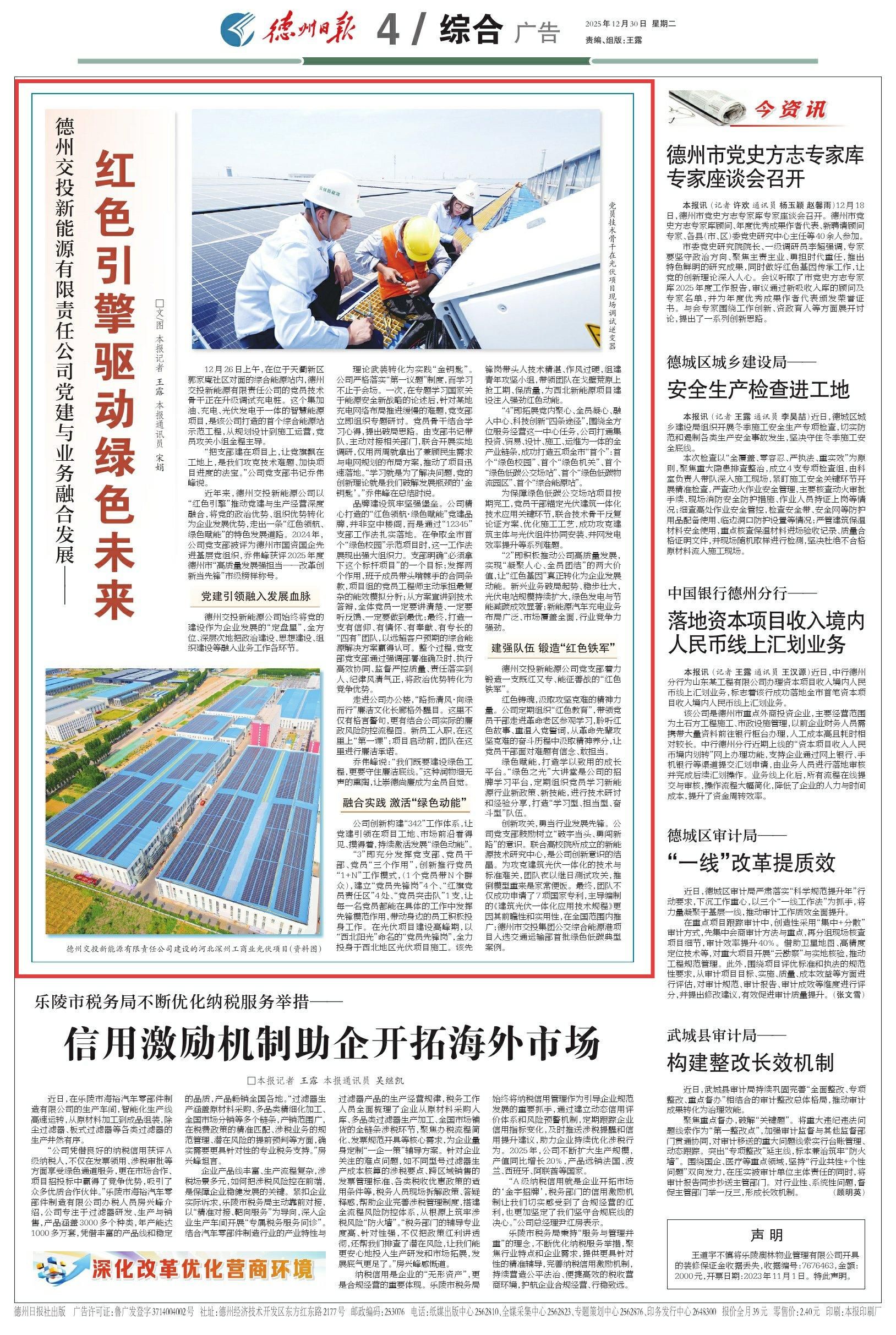 创新攻关,勇当行业发展先锋。公司党支部鼓励树立“破字当头、勇闯新路”的意识。联合高校院所成立的新能源技术研究中心,是公司创新意识的结晶。为攻克建筑光伏一体化的技术与标准难关,团队夜以继日测试攻关,推倒模型重来是家常便饭。最终,团队不仅成功申请了7项国家专利,主导编制的《建筑光伏一体化应用技术规程》更因其前瞻性和实用性,在全国范围内推广;德州市交投集团公交综合能源港项目入选交通运输部首批绿色低碳典型案例。