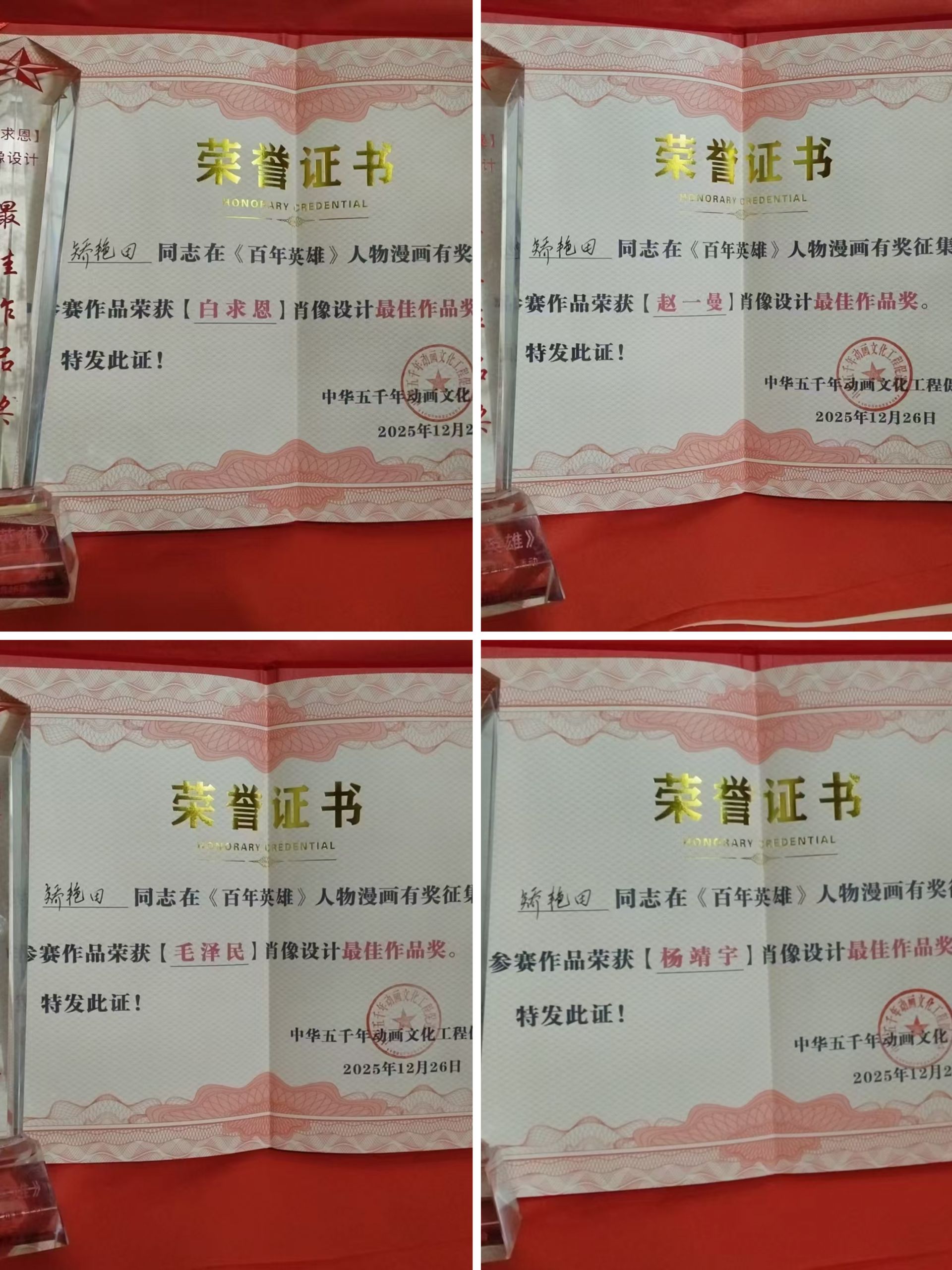 12月26日,由中华五千年动画文化工程促进会主办的《百年英雄》人物漫画有奖征集活动颁奖典礼在北京举行。活动前期,经过广泛征集、大众投票、专家评审等环节,从上千幅作品中选出了6幅作品获得最佳作品奖,其中德州籍漫画家矫健的4幅作品获奖。他的作品运用了中国传统的毛笔绘制,精湛的技法、细腻的描绘得到了专家评委的一致好评。