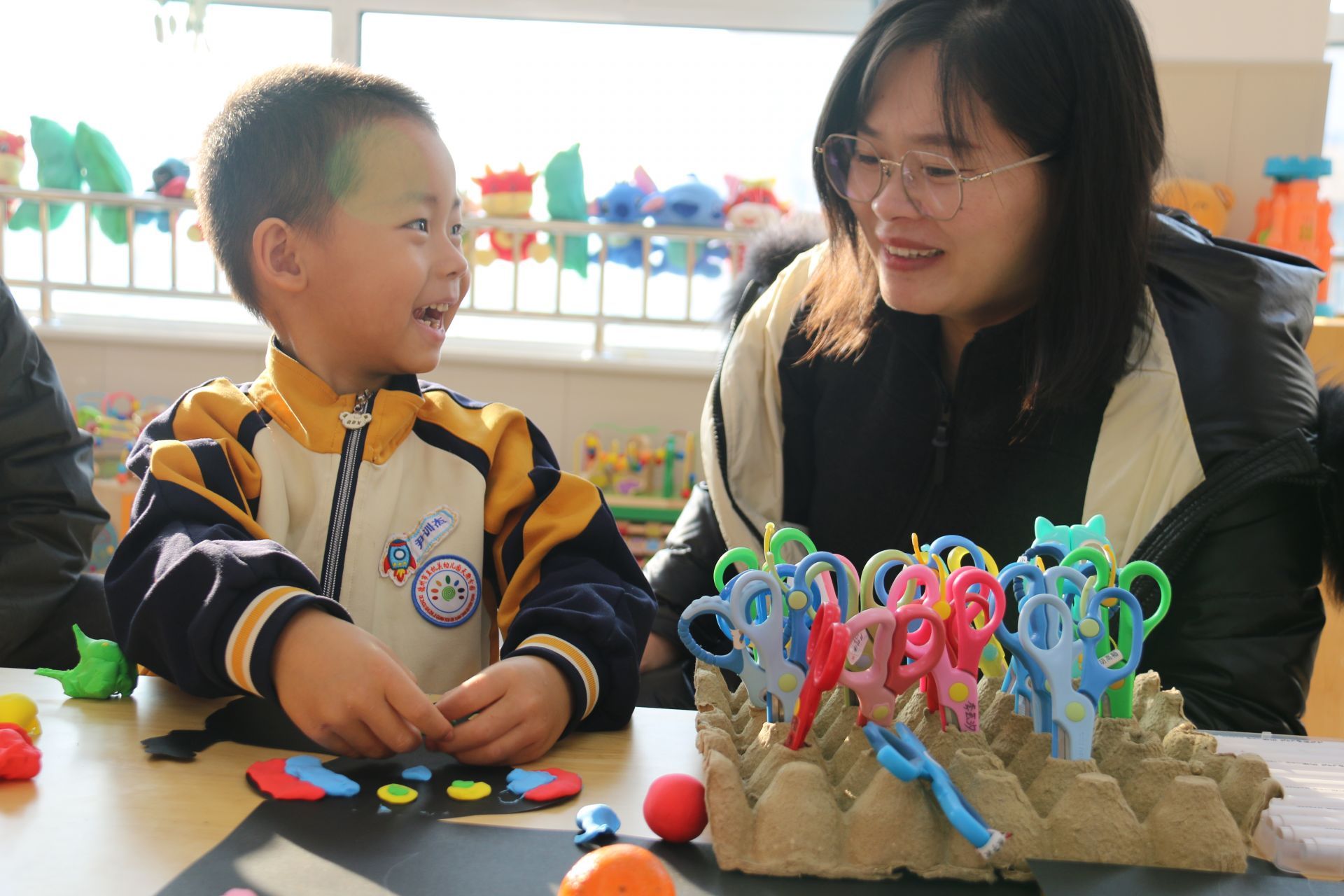 表演结束后,亲子游园体验开启。幼儿园一楼公共区域与各班教室化身非遗体验乐园,剪纸、拓印等传统技艺摊位前人头攒动。孩子们在家长的陪伴下,手持剪刀小心翼翼地裁剪红纸,勾勒出小兔子、福字、灯笼等吉祥图案,或手持拓印工具蘸取颜料,在宣纸上印出一幅幅古朴雅致的纹样,亲身感受传统工艺的独特魅力。
