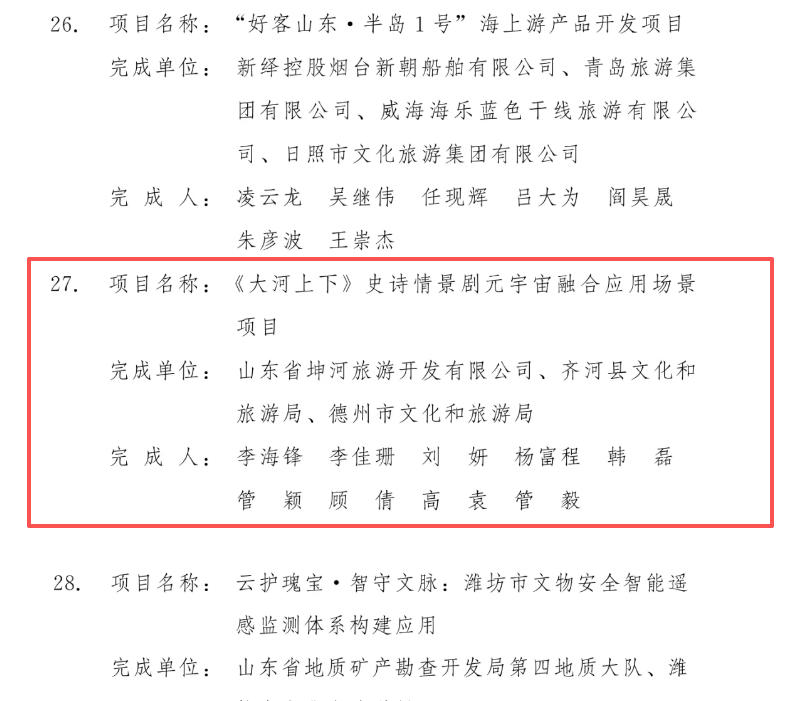 近日,山东省人民政府公布了第七届山东省文化创新奖获奖项目名单,全省共有30个创新成果入选,由山东省坤河旅游开发有限公司、齐河县文化和旅游局、德州市文化和旅游局联合申报的《大河上下》史诗情景剧元宇宙融合应用场景项目榜上有名。