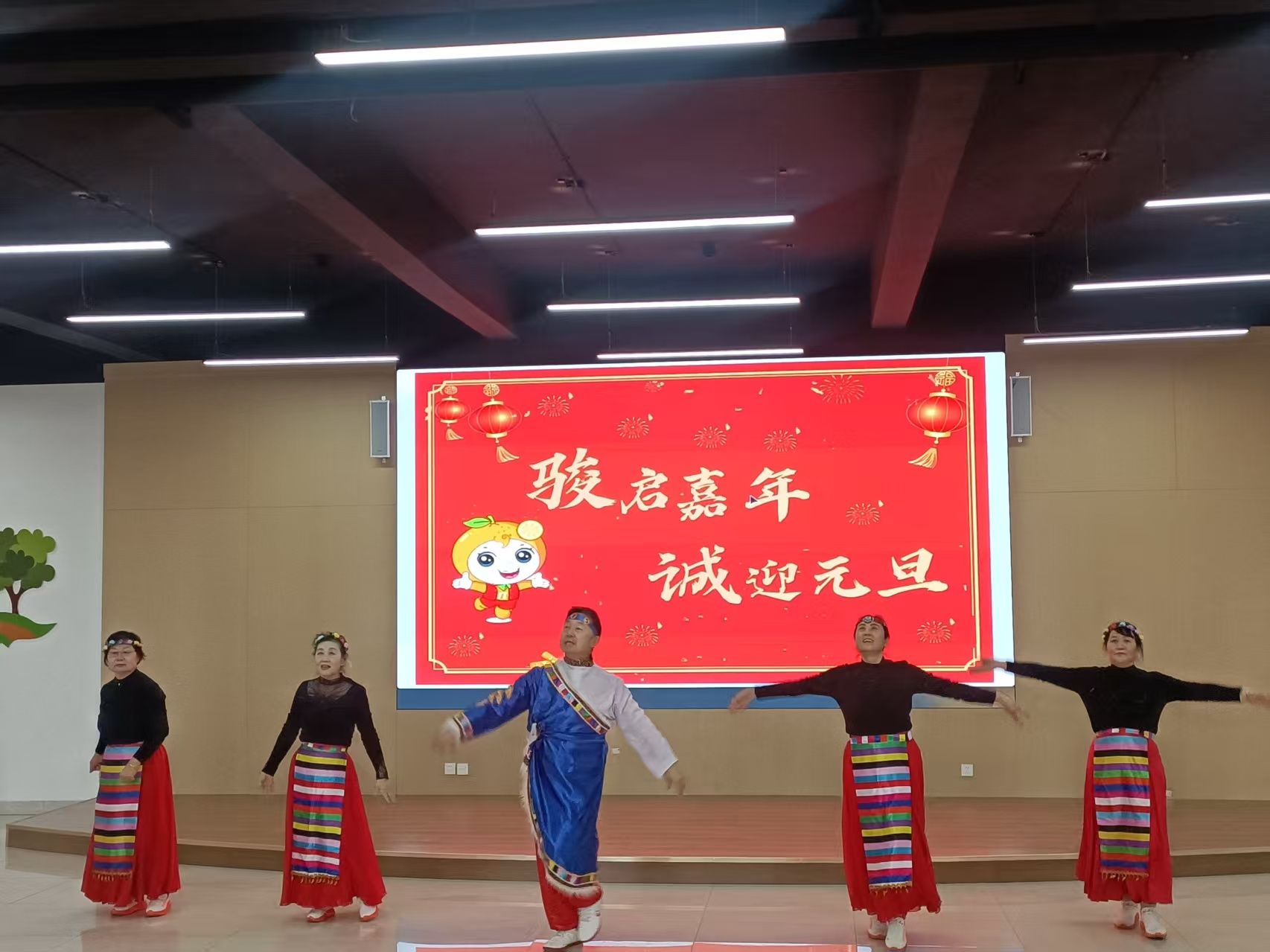 嘉诚社区联合共建单位德州市洛泰商贸有限公司,举办“骏启嘉年,诚迎元旦”文艺汇演。居民自编自演的节目形式多样,涵盖歌舞、曲艺等。红色歌曲《我爱你中国》《今天是你的生日我的祖国》抒发了家国情怀,京剧《沙家浜·定能战胜顽敌渡难关》等节目彰显传统韵味,葫芦丝演奏《月光下的凤尾竹》、藏族舞《我唱赞歌献祖国》以及柔力球、太极等表演则展现出居民的健康风采与艺术活力。