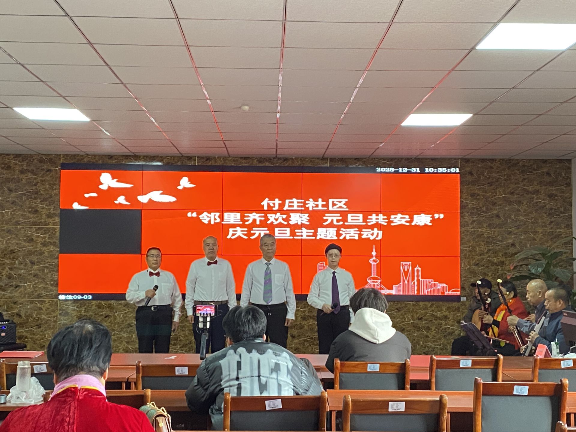 金鼎社区举办“庆元旦·传和谐·送文化”文艺汇演。社区乐团演奏了《幸福年》《我唱赞歌献祖国》等曲目,随后扇子舞、民歌演唱、吕剧选段等节目纷纷亮相,展现出深厚的群众文化底蕴。整场演出均由居民自发组织与表演,营造出浓厚的节日氛围。