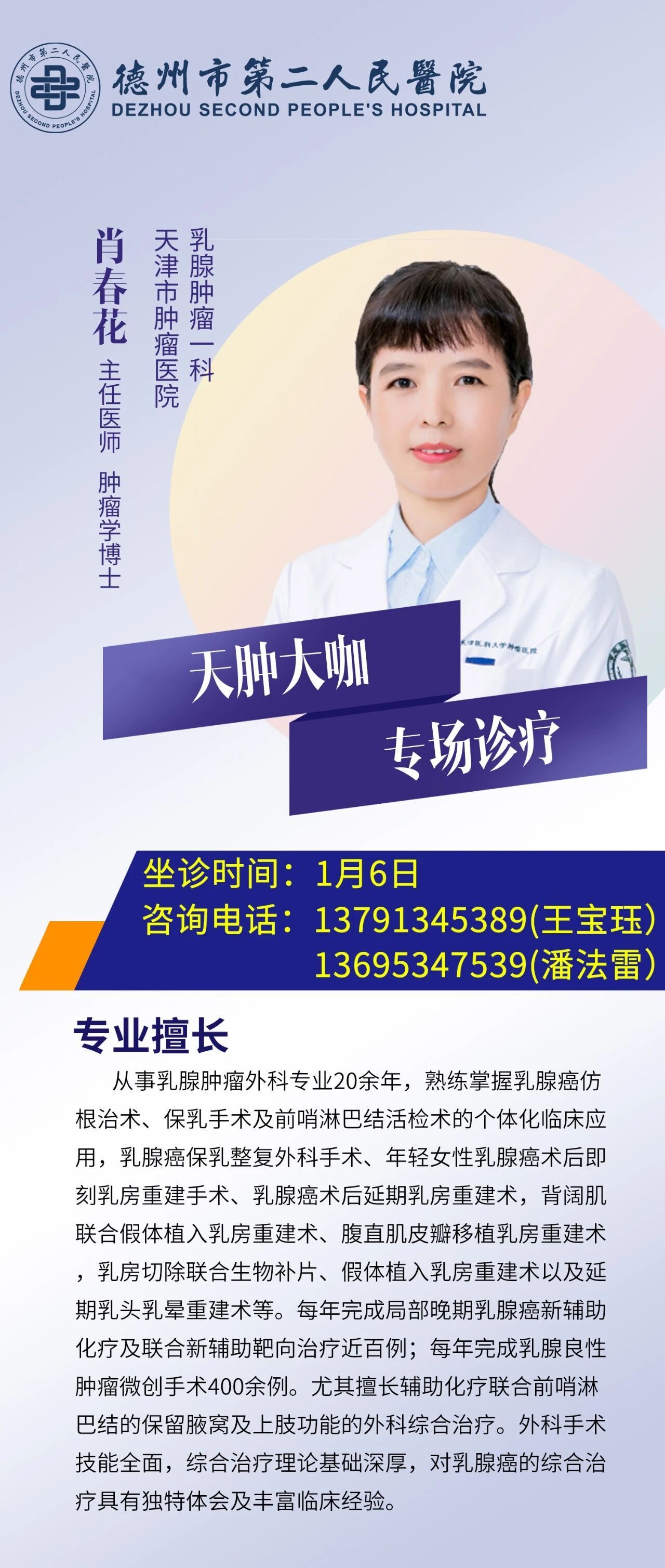专家有约 | 1月6日,天津市肿瘤医院肖春花教授到德州市第二人民医院开展诊疗活动 2026-01-05 16:51 德州日报 0 1月6日,天津市肿瘤医院乳腺肿瘤一科肖春花教授到德州市第二人民医院开展诊疗活动,患者可提前预约咨询。 德州日报新媒体出品通讯员|王晓军 编辑|张洁审核|滕璐 终审|李玉梅