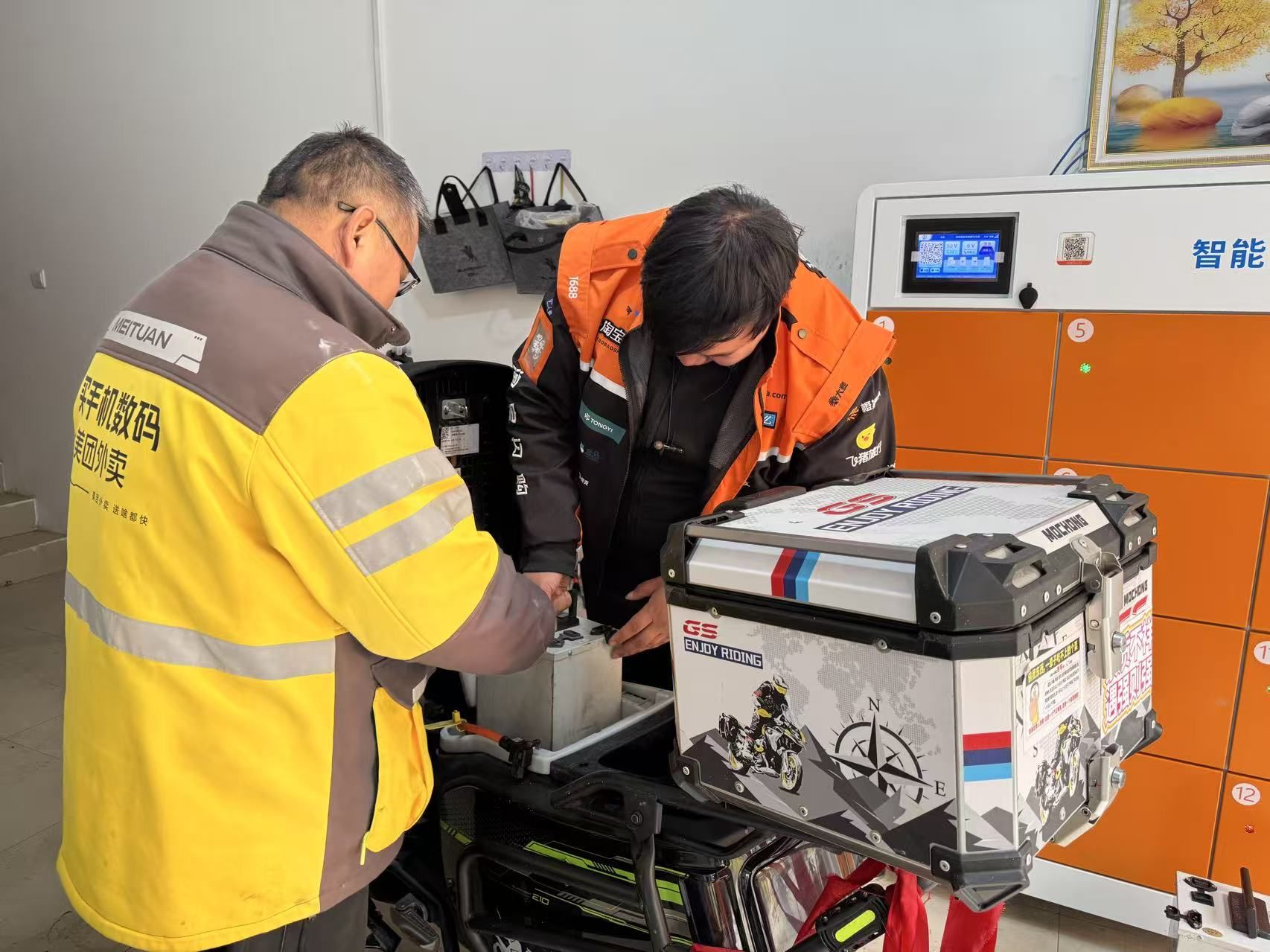 有的自己到屋里取出扳手,拧拧配送车松动的零件;有的把车推进屋里,在换电柜取出电瓶换上;有的远远地喊:“柱子哥,补一下车胎。”