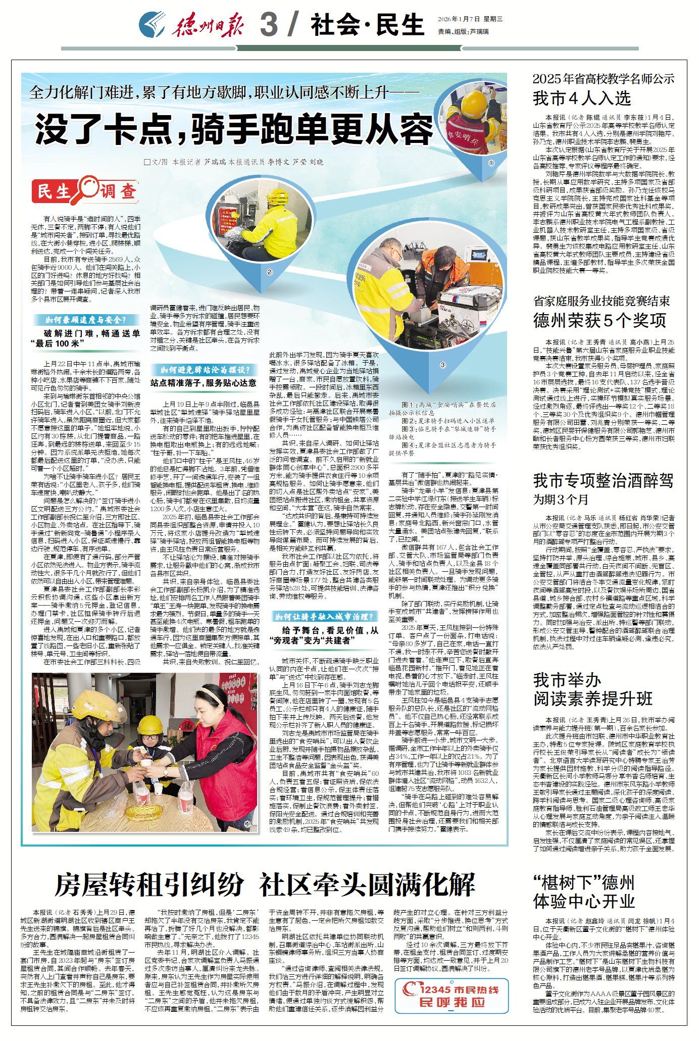 目前,我市有专送骑手2569人,众包骑手近9000人。他们在闯关路上,小区的门好进吗?休息的地方好找吗?相关部门是如何引导他们参与基层社会治理的?带着一连串疑问,记者深入我市多个县市区展开调查。