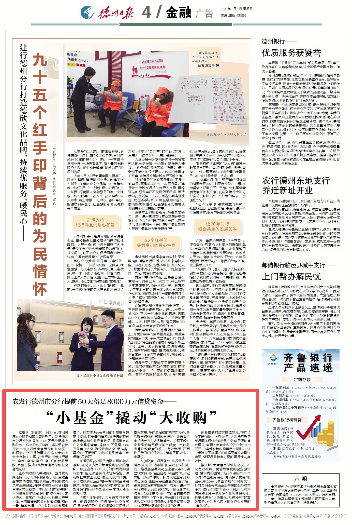 上月31日,齐河绿源农业服务有限公司收到了农发行德州市分行发放的首笔4000万元粮棉油收购贷款。这笔贷款的落地,得益于农发行德州市分行粮食信用保证基金模式的探索。作为保障国家粮食安全的政策性金融主力军,农发行德州市分行锚定“全粮、全链、全行、全力”的发展思路,目前已推动3笔粮食信用保证基金落地见效。