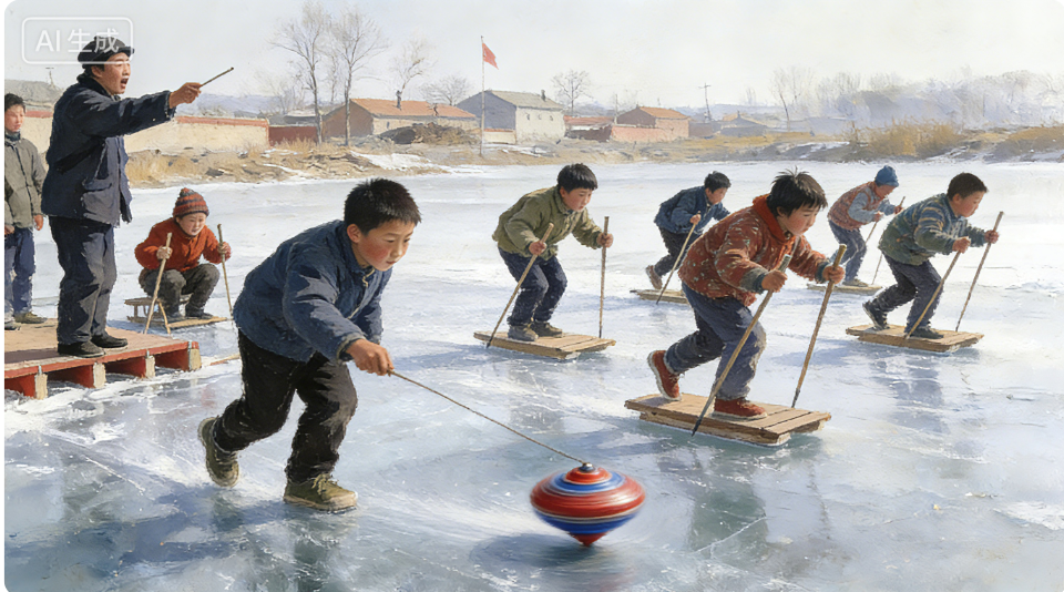 那时的滑冰与今日不同——我们用的是自制的长方形木板和木质冰钎。十几名伙伴定好起点、距离和终点,一声令下,便争先恐后滑向终点。每人滑行二十次,结束后不论胜负都不纠缠,次日再赛。胜利者的“奖品”,是用大拇指按住中指的指甲,弹对方的脑门——正因如此,大家都拼尽全力。三九的寒风中,虽冷得刺骨,却玩得满头大汗,即便家长喊吃饭也不愿回家。