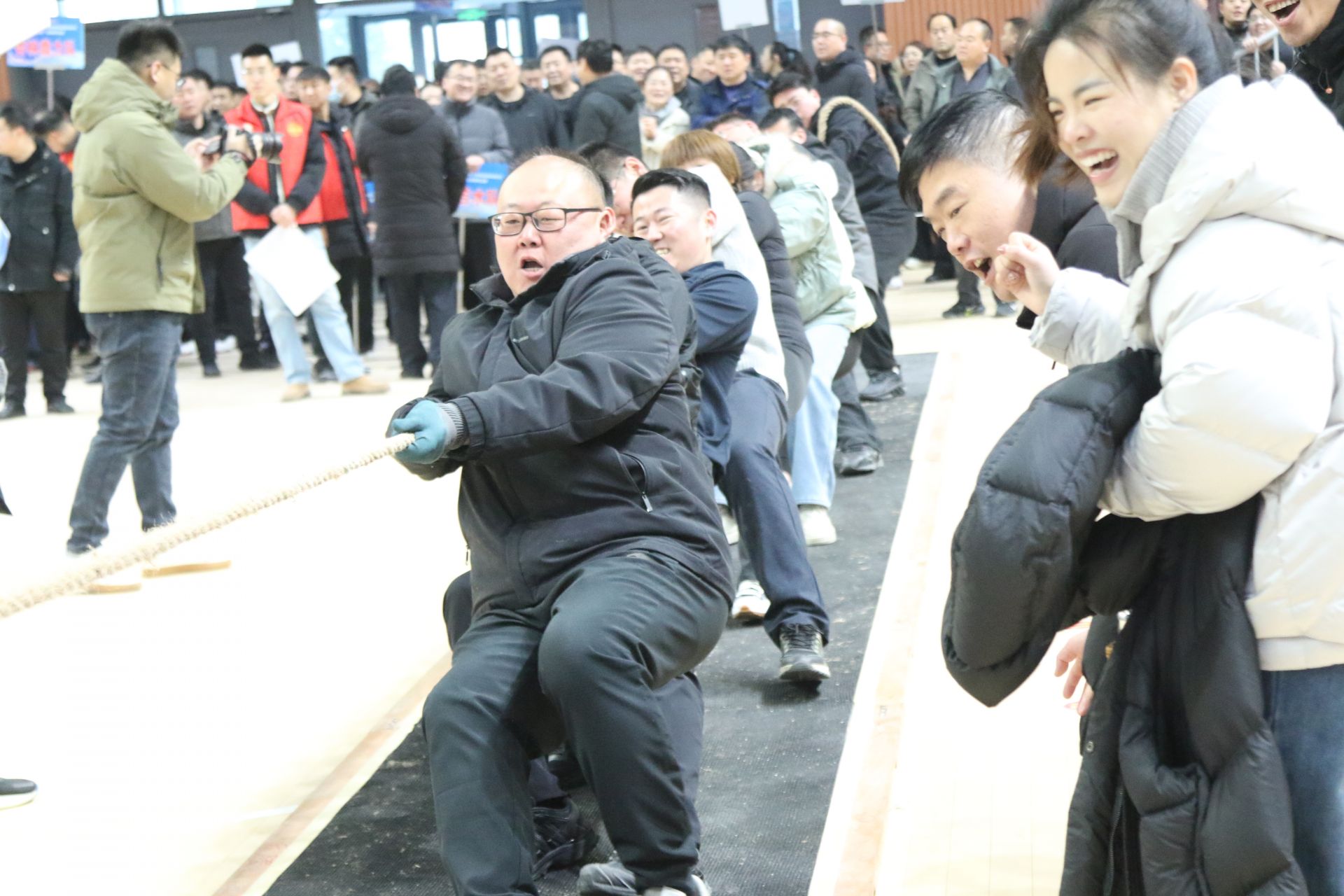 一根绳、一股劲、一条心。现场,呐喊声、助威声此起彼伏。队员们紧握长绳,身体后倾,咬紧牙关,拼尽全力。场下,观众时而高喊助威,时而屏住呼吸,紧张注视着场上一举一动。随着中心标记偏向一侧,欢声四起,从循环赛入围淘汰赛给人们带来无尽喜悦。
