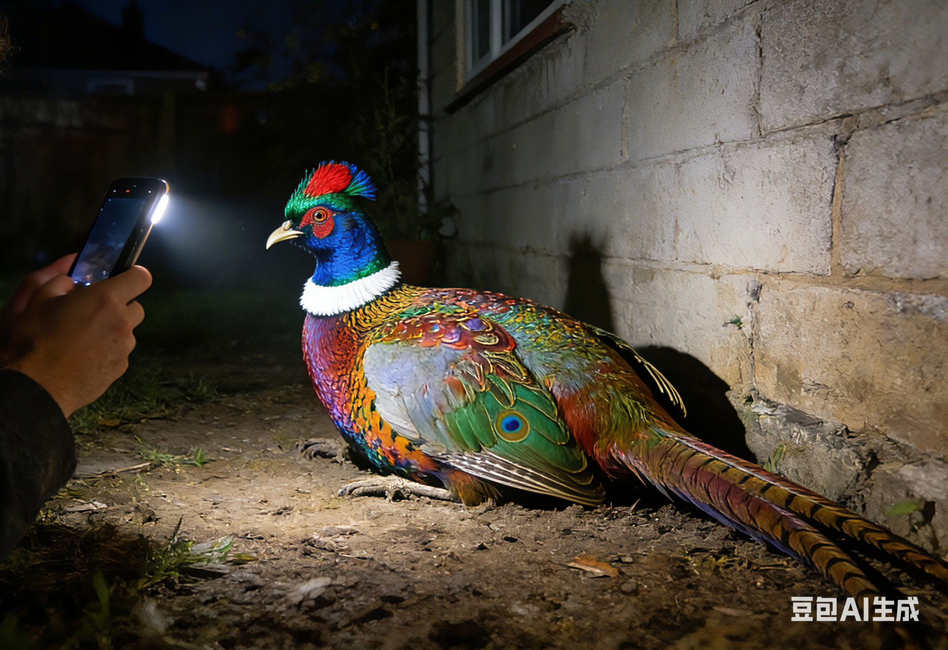 我正边走边漫无边际地遐思,突然,一个黑影带着风声从我头顶掠过后,落到面前的墙角处。我大吃一惊,急忙本能地低头躲避,同时脑海里迅速判断这“入侵者”:是断了线的风筝,还是失控的无人机?我迅速地从裤兜里掏出手机,打开手电察看——啊!出乎意料,竟然是一只硕大漂亮的鸟!这只鸟从头到尾差不多有九十厘米长,脑袋上像是戴着一顶镶嵌着宝石蓝、孔雀绿,还点缀着一抹红的华贵羽冠,脖子上有一圈洁白的羽毛,更像亲友敬献的哈达。它背部的五彩羽毛亮如锦缎,在两只硕大的翠羽翅膀的衬托下,显得无比绚丽悦目。更让我惊喜的是它那漂亮的尾翼,竟然长达六十厘米左右,让我立刻想到京剧里穆桂英头上戴的那对玉米黄与石墨黑相间的雉翎。我兴奋地一把按住它的双翅,把它抱起来,一边大声唱起邓玉华演唱的《五彩云霞》:“五彩云霞空中飘,天上飞来金丝鸟……”老伴听到这五音不全的歌声,拉开门笑着问:“又犯什么神经呢?”我说:“快来看,上天给咱们送吉祥鸟来了!”老伴打开门灯,看到我抱着这么漂亮的大鸟,也惊喜万分。我俩一边兴奋地察看,一边分析:这只鸟比较怕人、怕光,喙和爪子都不特别尖利,应该不是猛禽;而且它身上没有外伤,很可能是受市区灯光干扰迷了路,累得飞不动才落下来的。它说不定还是国家重点保护野生动物,咱们得善待它。达成共识后,老伴找来一个大纸箱,又用小盆子盛上清水,盘子里放上大米和小米;我把鸟轻轻放进箱子,再把箱子搬到厢房,关上灯,好让它安心吃食、休息。