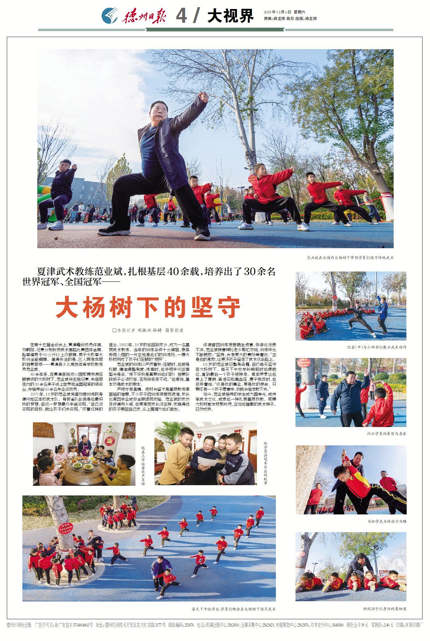 在深入采访挖掘范业斌的故事后,德报先后推出《大杨树下的坚守》《夏津范业斌:扎根基层,我很自豪》《大杨树下走出30余位全国、世界武术冠军》《教练因材施教具象化了》等图文、短视频作品,讲述了一位基层武术教练用青春和汗水为孩子们搭起通往梦想桥梁的故事。