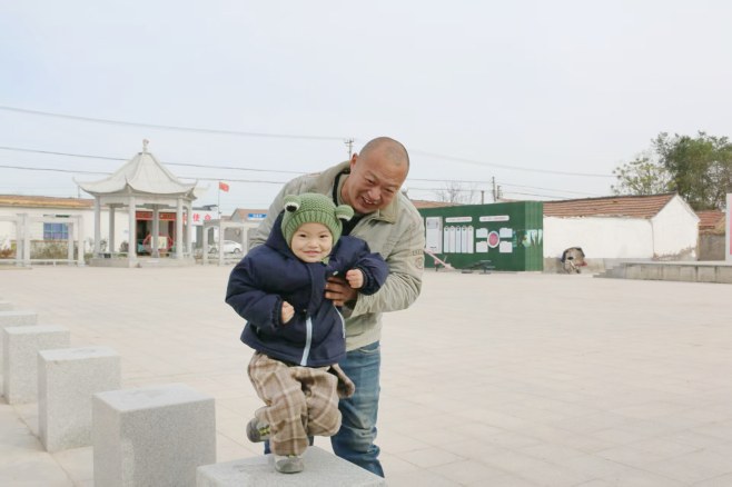 村内广场上,老人带着孩子玩耍