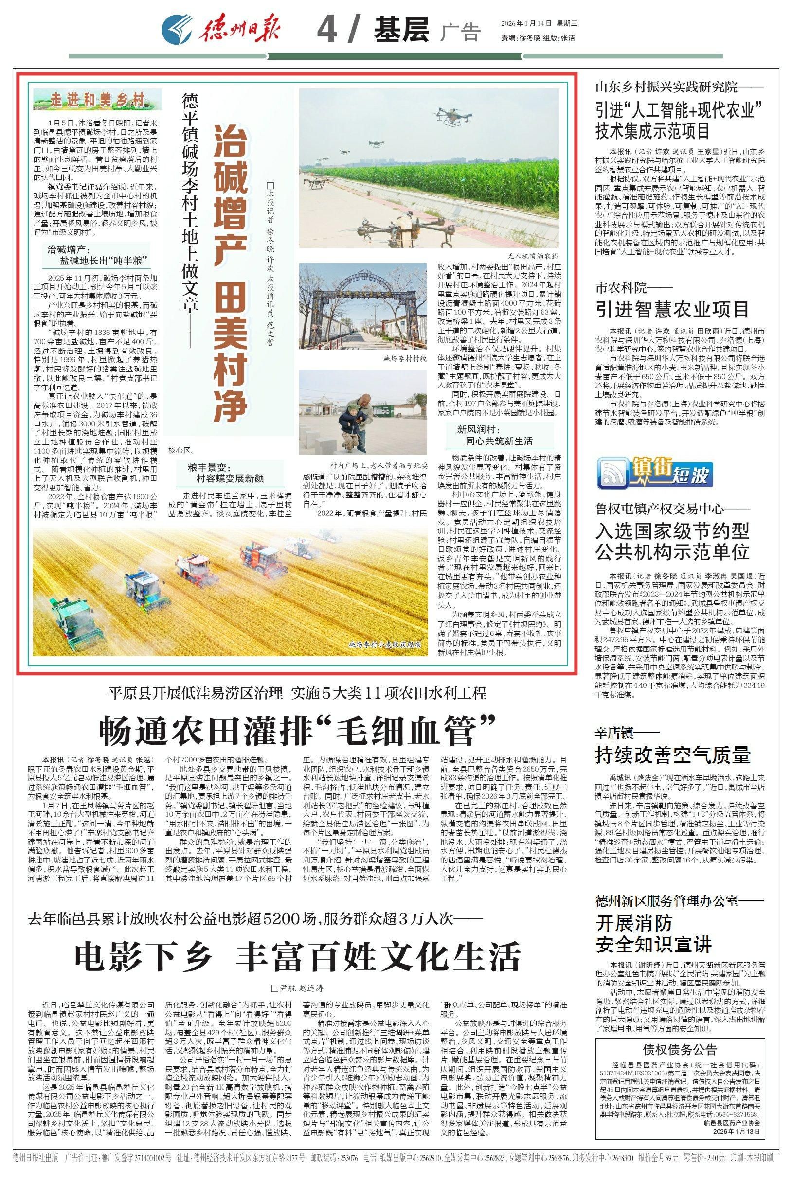 1月5日,沐浴着冬日暖阳,记者来到临邑县德平镇碱场李村,目之所及是清新整洁的景象:平坦的柏油路通到家门口,白墙黛瓦的房子整齐排列,墙上的壁画生动鲜活。昔日贫瘠落后的村庄,如今已蜕变为田美村净、人勤业兴的现代田园。