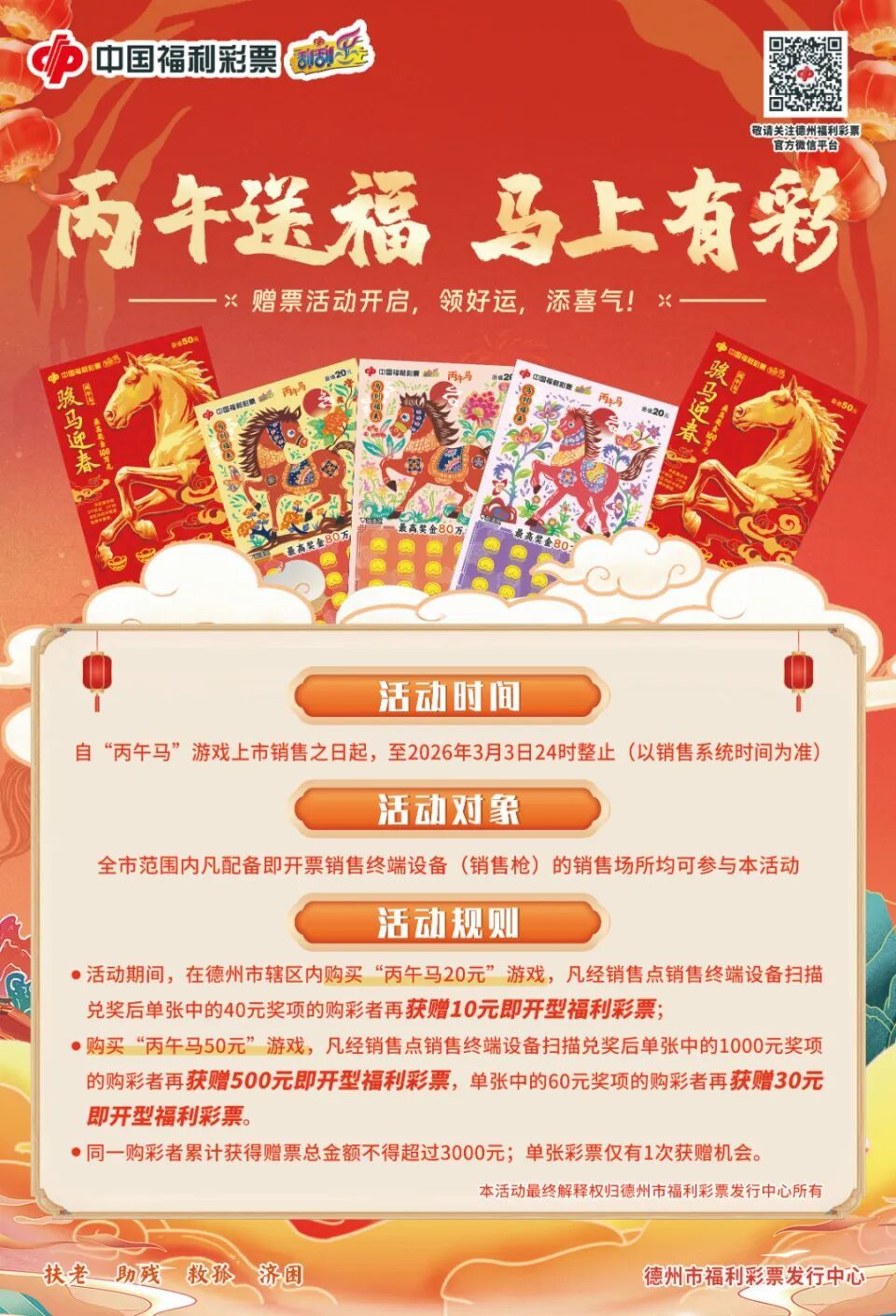 活动期间,在德州市辖区内购买“丙午马20元”游戏,凡经销售点销售终端设备扫描兑奖后单张中得40元奖项的购彩者再获赠10元即开型福利彩票。