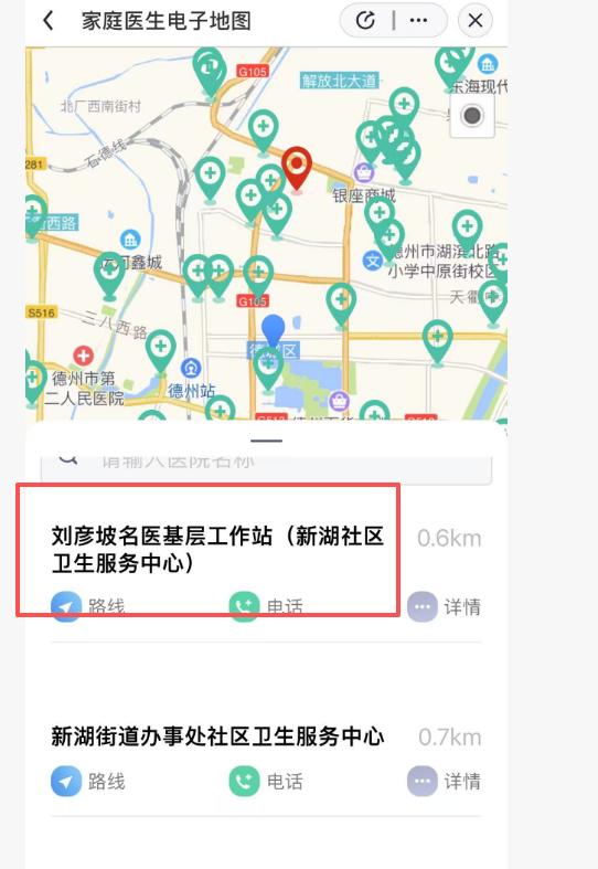 第三步:点击家庭医生电子地图,进入机构列表页面。根据居民所在位置,自动推送就近的服务机构。支持按照地区查询机构信息。