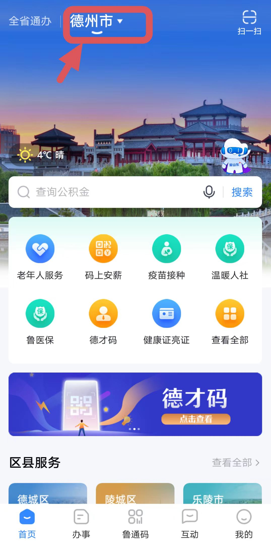 第二步:登录爱山东APP后,左上角地区切换为现住地区,在首页搜索框搜索“家庭医生”进入家庭医生电子地图。