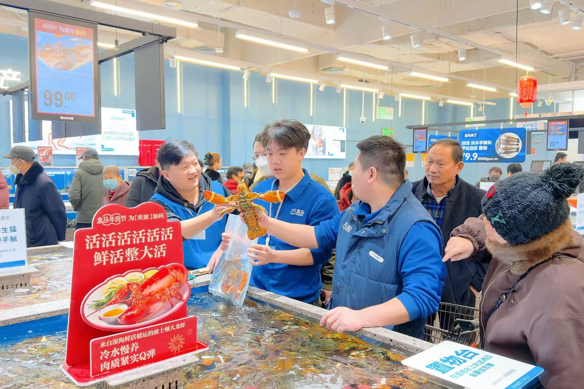 作为数据和技术驱动的新零售标杆,盒马鲜生打造了5000平方米沉浸式购物空间,涵盖生鲜、烘焙、有机蔬菜、时令水果、鲜花等全品类商品,波士顿龙虾、挪威三文鱼等全球好物直供市民,实现“不出德州 尝遍世界”的消费体验。新春消费季期间,门店还上线了新春限定福利与年货礼盒,叠加满减、折扣等优惠,点燃市民团圆消费热情。