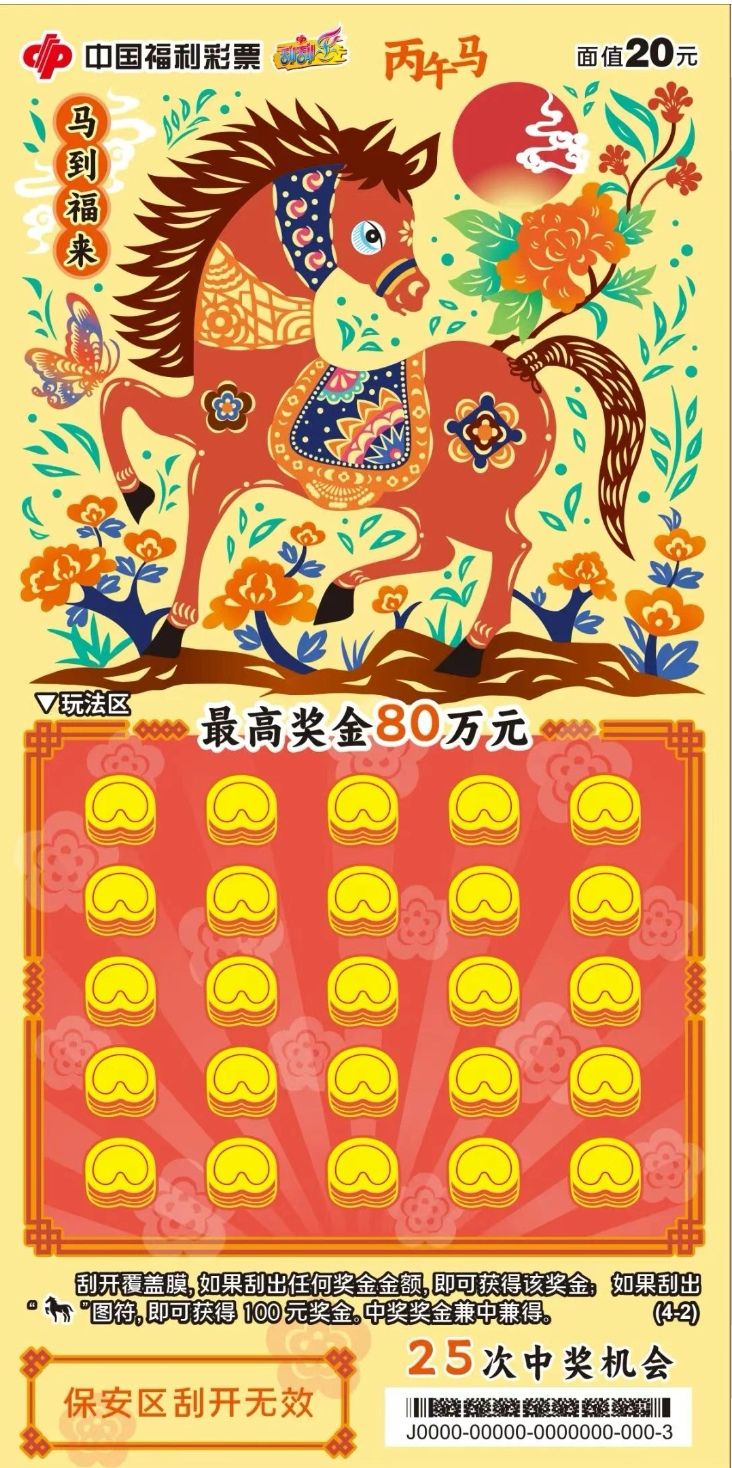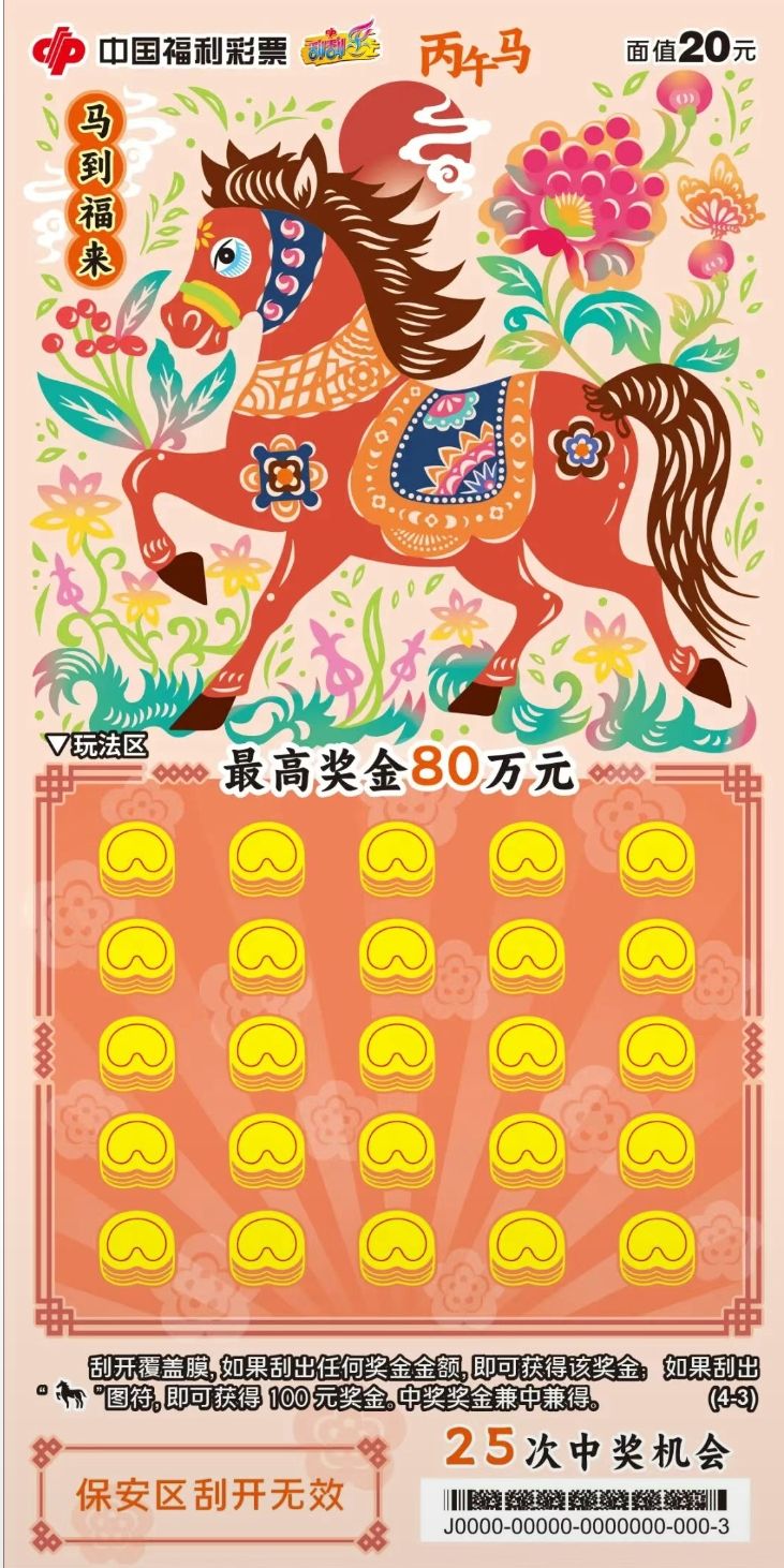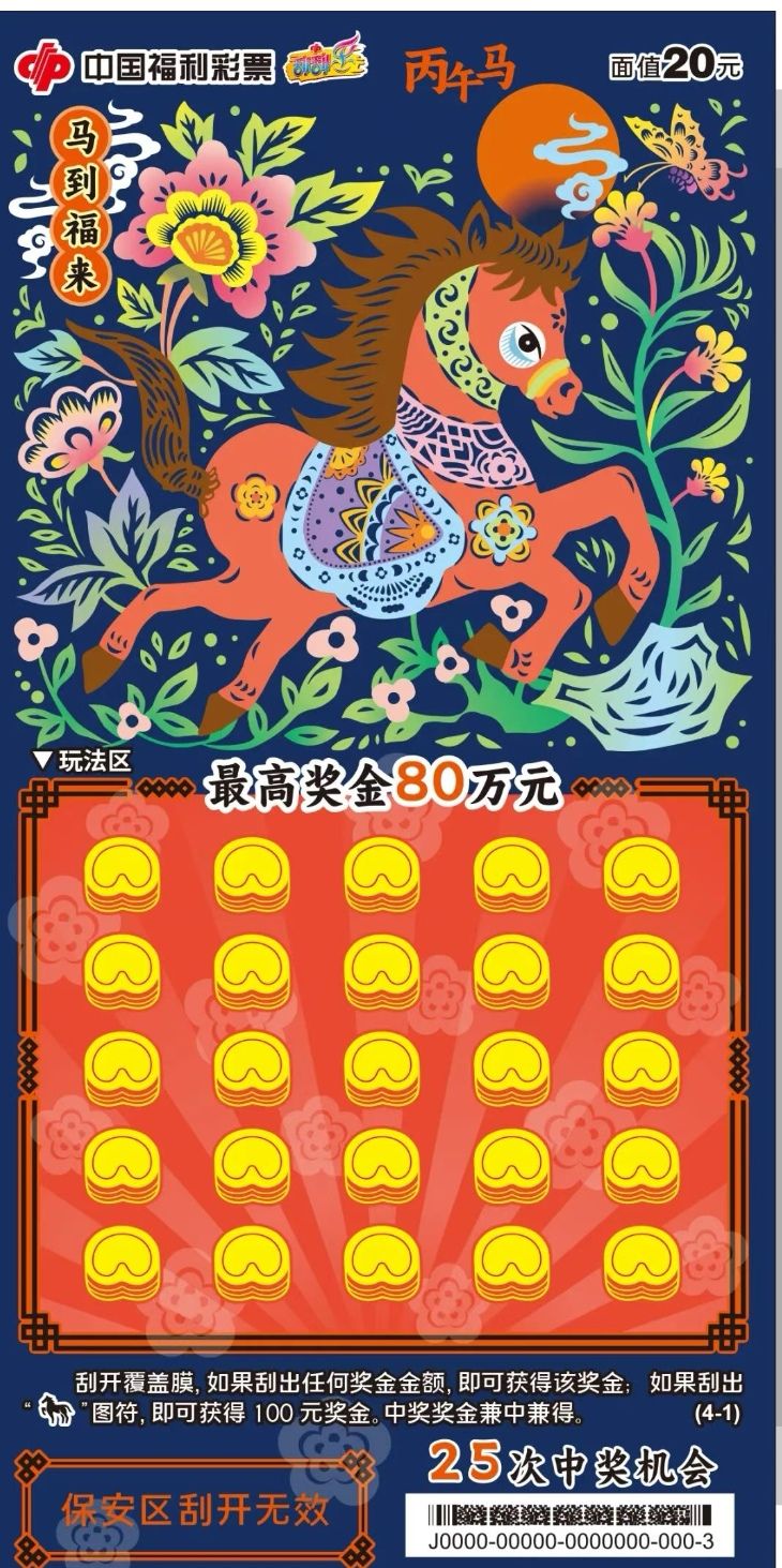 金马报喜,福彩送福。值此新春佳节来临之际,中国福利彩票“丙午马”生肖主题系列即开票温情上市。福彩“丙午马”生肖主题即开票包括五款游戏,其中,20元“马到福来”四个票面色彩明快,融入非遗剪纸工艺,以细腻的镂空线条生动展现骏马奔腾之姿,兼具观赏性与收藏价值。