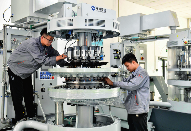 在位于山东省嘉祥县的山东联峰精密科技有限公司,工作人员在组装精密机床(2025 年 6 月 6 日摄) 郭绪雷摄 / 本刊