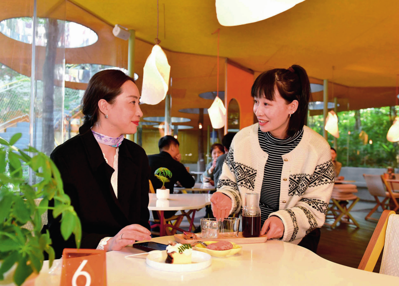 山东省五莲县白鹭湾小镇是山东省乡村振兴齐鲁样板示范区。图为在五莲县白鹭湾小镇咖啡与树咖啡厅,咖啡师赵敏 (右)为客人端来茶点(2024 年 10 月 23 日摄) 郭绪雷摄 / 本刊