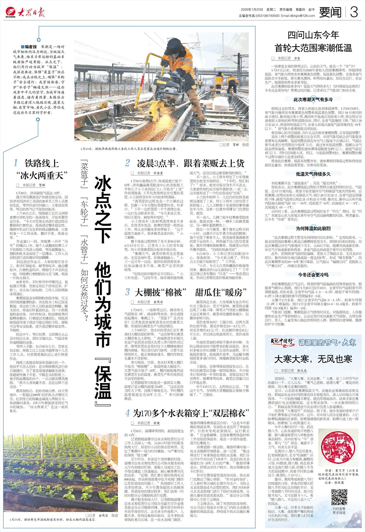 ■编者按 寒潮是一场对城市韧性的压力测试。当极端天气来袭,维系日常运转的基础系统面临严峻考验。冰点之下,他们用行动为城市“保温”:或深夜奔波,保障“菜篮子”供应不断;或在冰轨之上,确保“车轮子”安全通行;或穿梭街巷,守护“水管子”畅通无阻……这些风雪中平凡的坚守,为城市传递着温度、储存着热量。本报派出多路记者深入铁路沿线、蔬菜大棚、农贸市场、居民小区,带你走近这些冬日里的守护者。