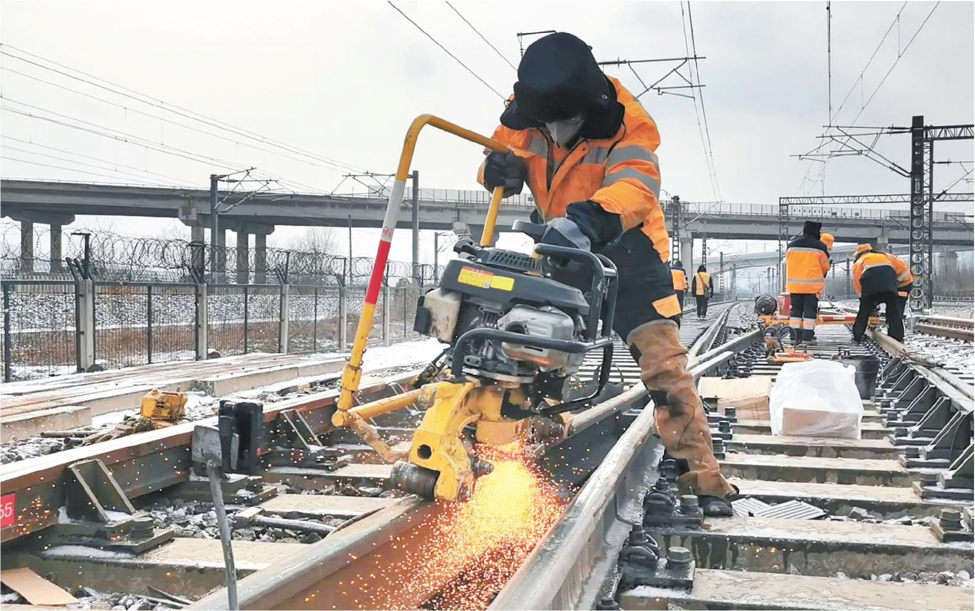 雪停人不歇。11点50分左右,党家庄站北侧,焊修工区工长陈书超带领十几名工作人员,对前期更换的岔心进行焊接作业。