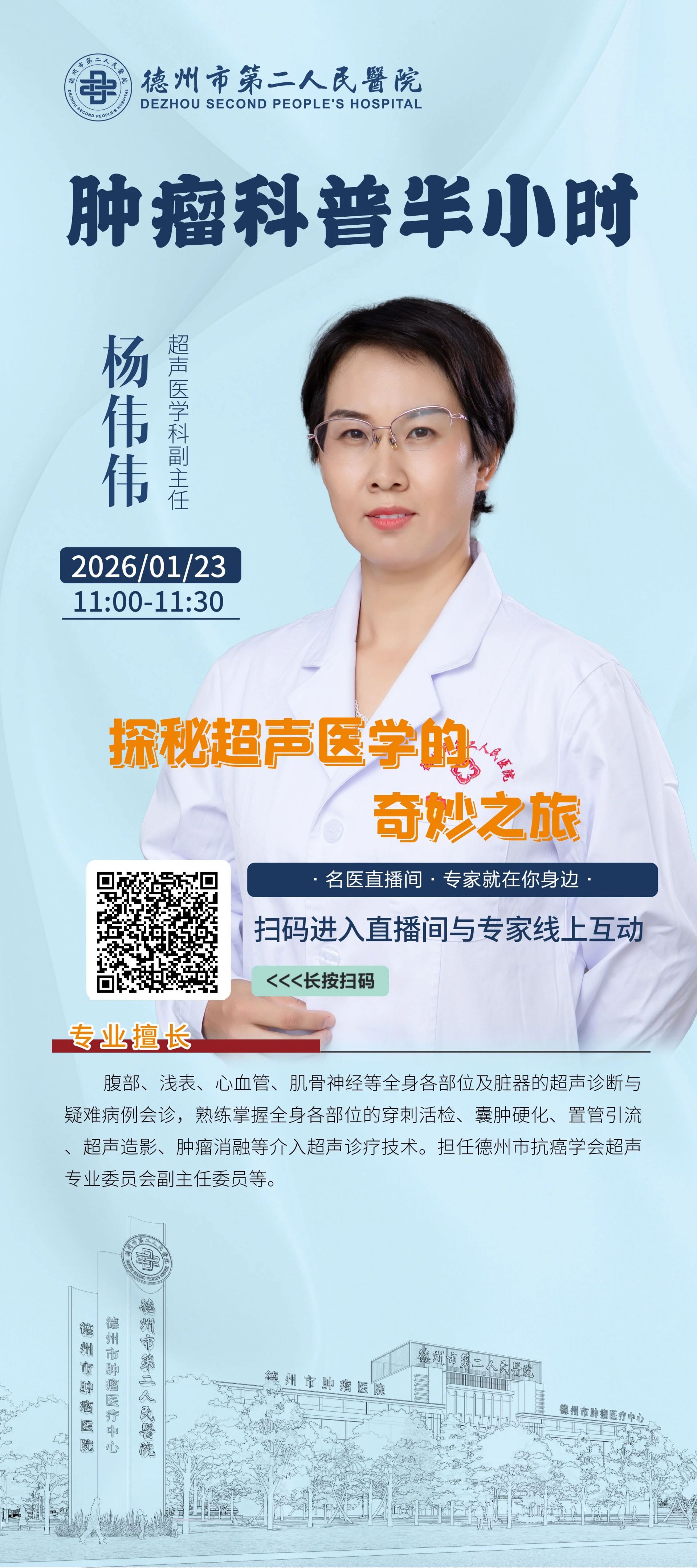 《肿瘤科普半小时》直播预告 | 1月23日,德州市第二人民医院超声医学科专家讲解超声医学检查相关问题 2026-01-22 12:10 德州日报 0 1月23日11:00,德州市第二人民医院将进行《肿瘤科普半小时》直播活动。本次直播将邀请德州市第二人民医院超声医学科副主任杨伟伟,对超声医学检查相关问题答疑解惑,敬请关注。 德州日报新媒体出品通讯员|王晓军 编辑|张洁审核|滕璐 终审|李玉梅