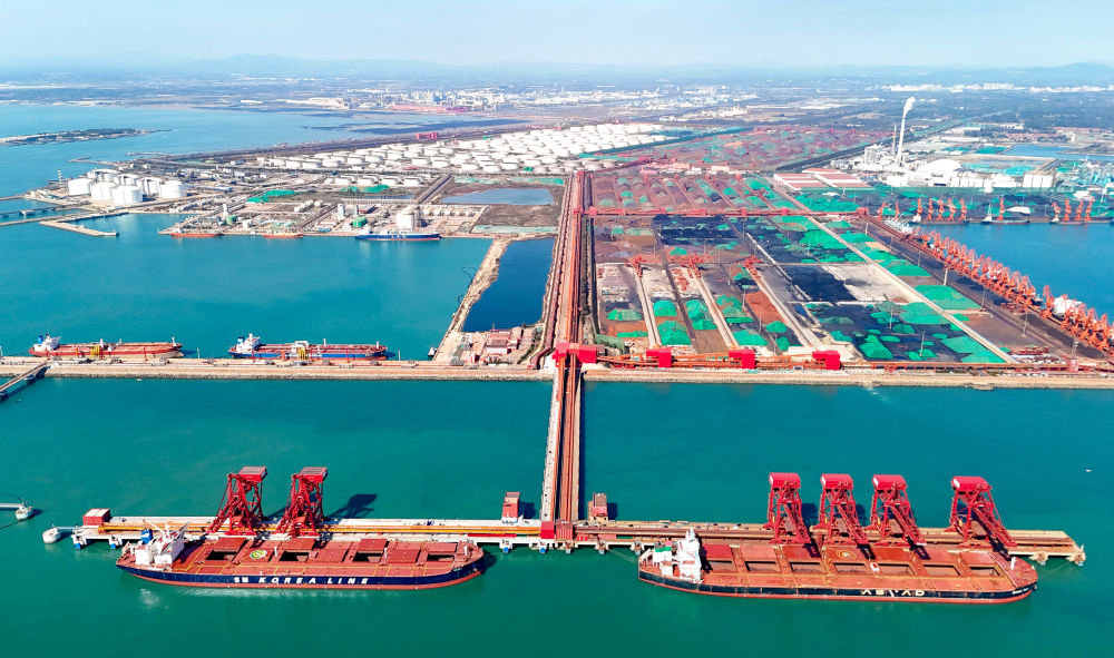 在山东青岛拍摄的山东港口青岛港第二座40万吨矿石码头(2025年10月27日摄,无人机照片)。新华社发(张进刚摄)