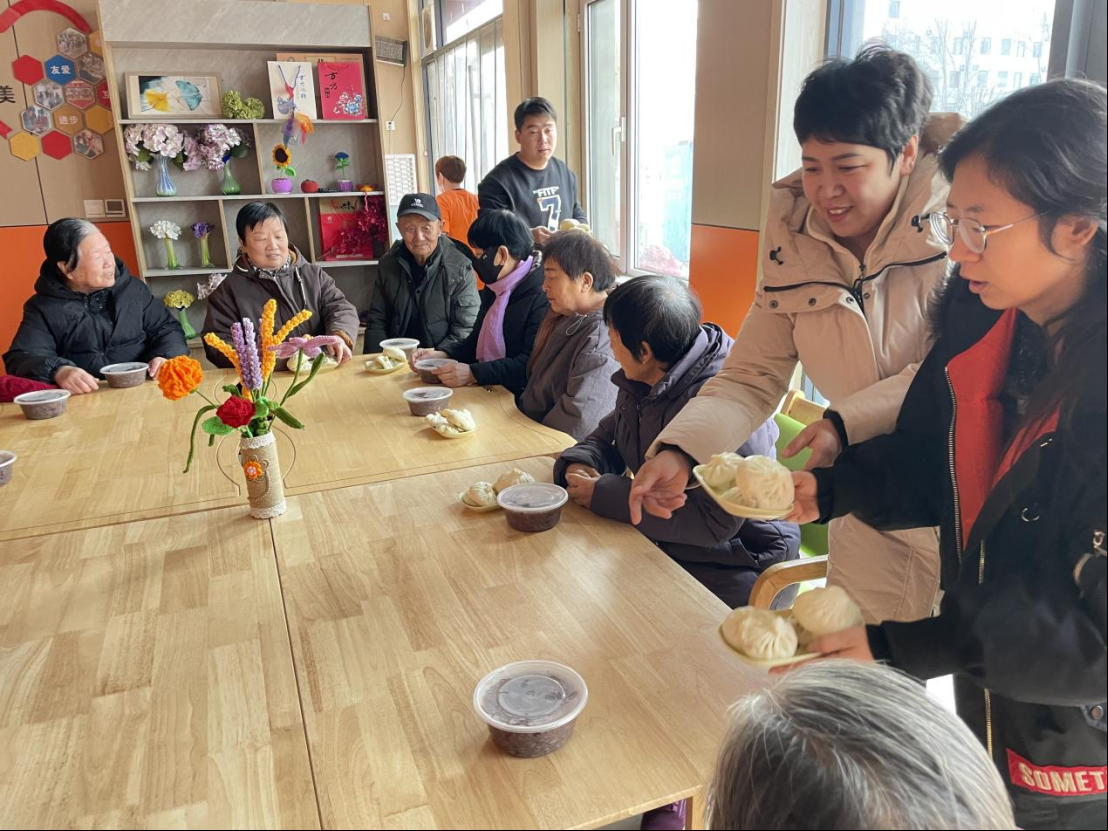活动现场,桌子旁围坐着十余位居民,大家面带笑容,聆听社区工作人员讲解腊八节的传统文化。志愿者们细心地将一盘盘手工制作的包子、一碗碗精心熬制的腊八粥递到居民手中。这些包子和腊八粥都是幸福食堂当天现做现发,包子皮薄馅大,腊八粥用料丰富、软糯香甜,获得了居民们的一致好评。此次活动共发放腊八粥、包子各10余份。