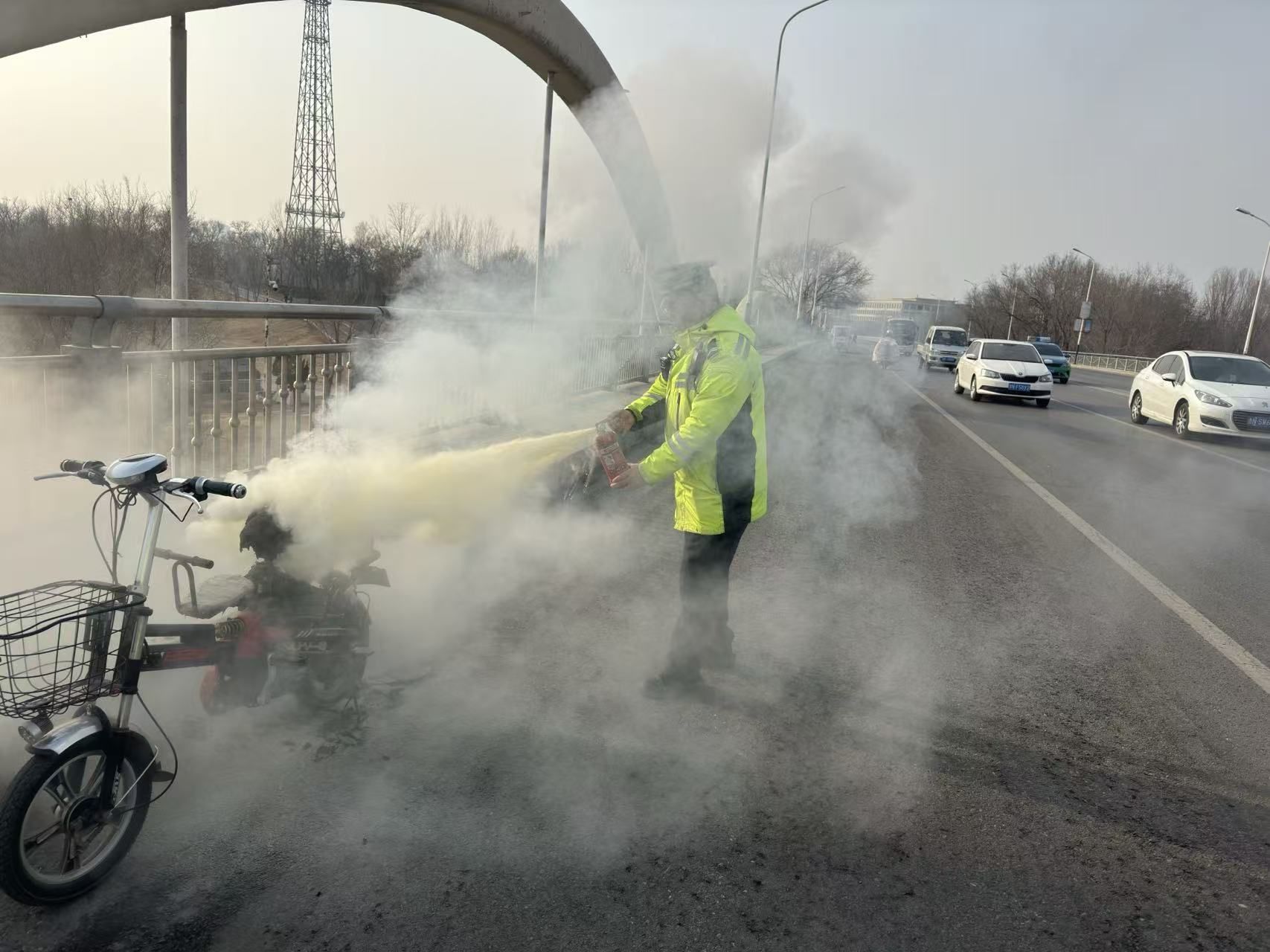 1月26日下午,在德城区大学路岔河桥上,一辆电动自行车突发自燃,现场浓烟滚滚。此时,德州市公安局交通管理支队天衢新区长河大队巡逻警力发现警情后,迅速赶往火情地点。