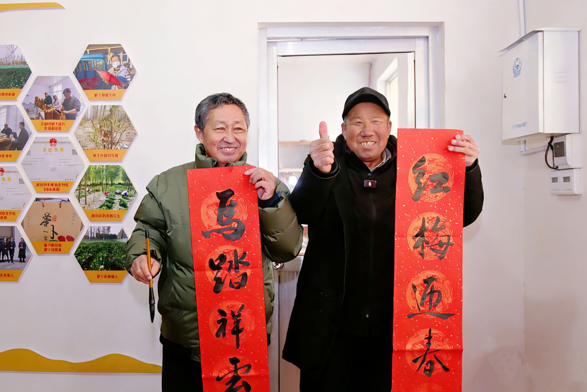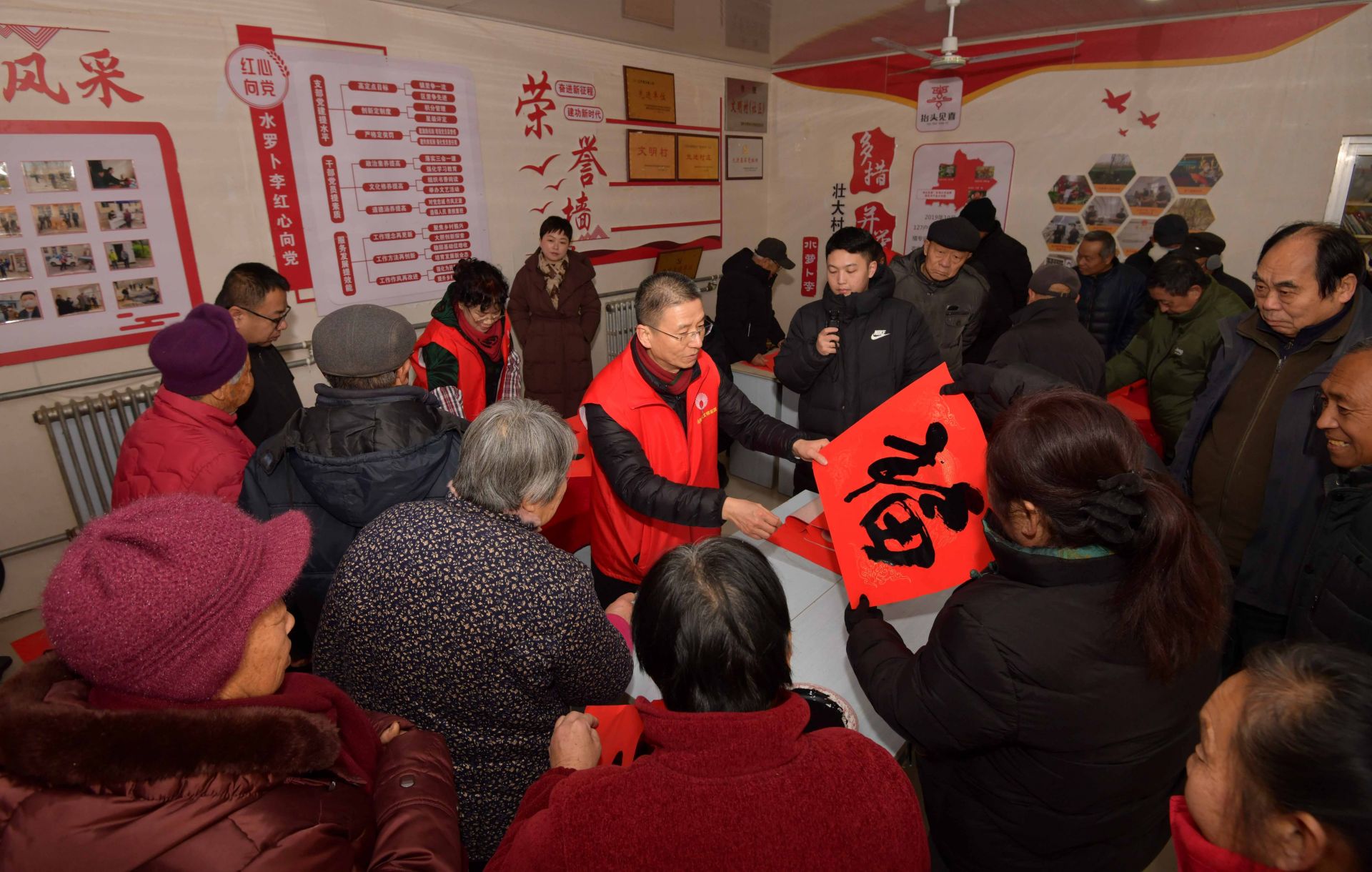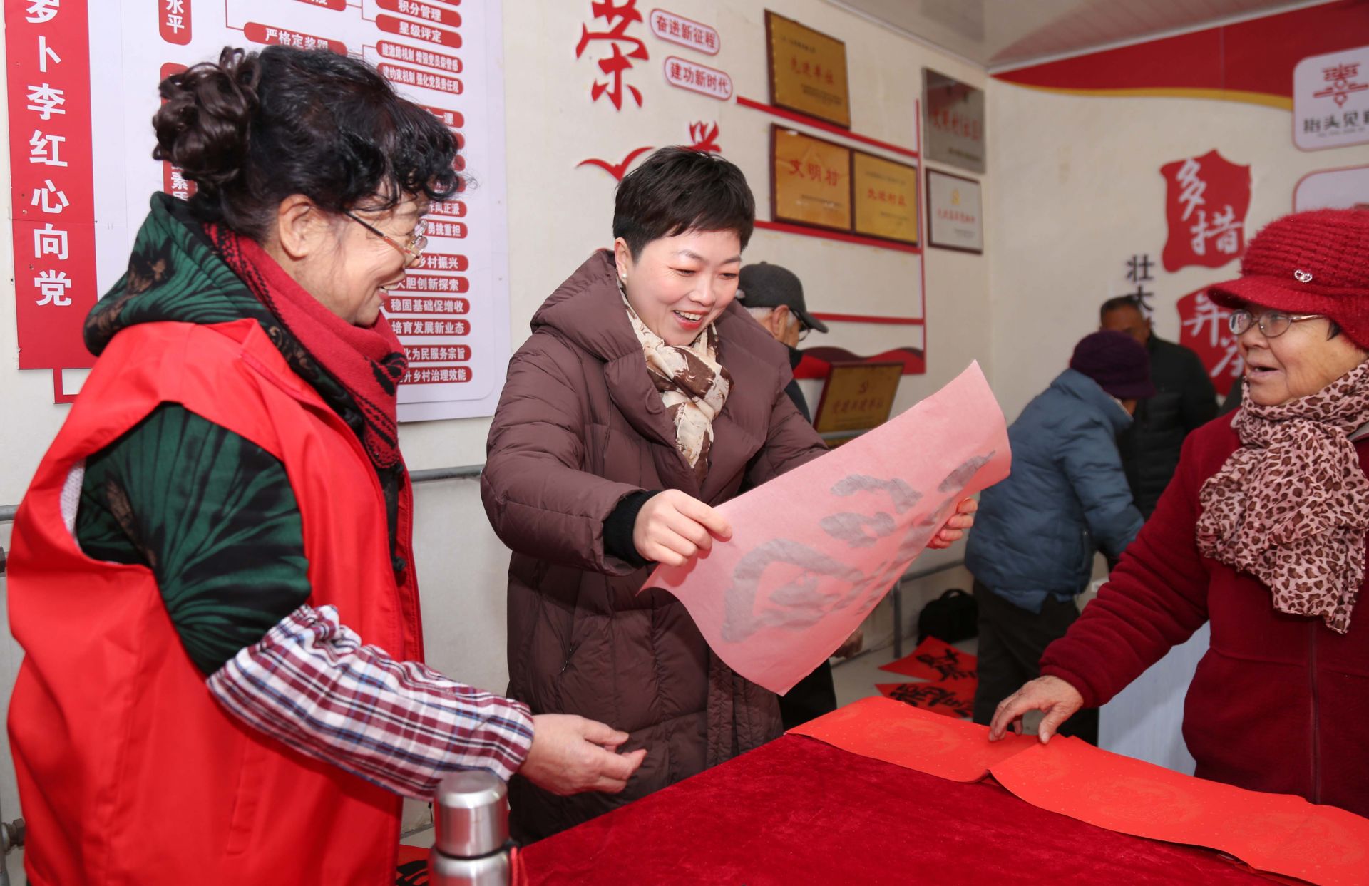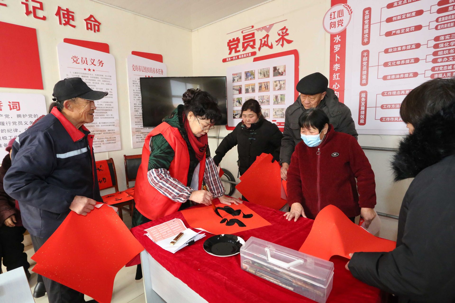 与此同时,村党支部会议室里墨香四溢,年味十足。书法志愿者们挥毫泼墨,笔走龙蛇,一副副寓意吉祥的春联、一张张饱蘸祝福的“福”字在他们笔下诞生,吸引了众多村民驻足观赏、排队领取。“这现场写的春联,比买的更有味道!”“今天咱村里真热闹,照相馆和‘书法展’都搬到门口了,免费拍照还能领‘福’,太高兴了!”欢声笑语充满了整个院落,喜庆祥和的气氛驱散了冬日的寒意。