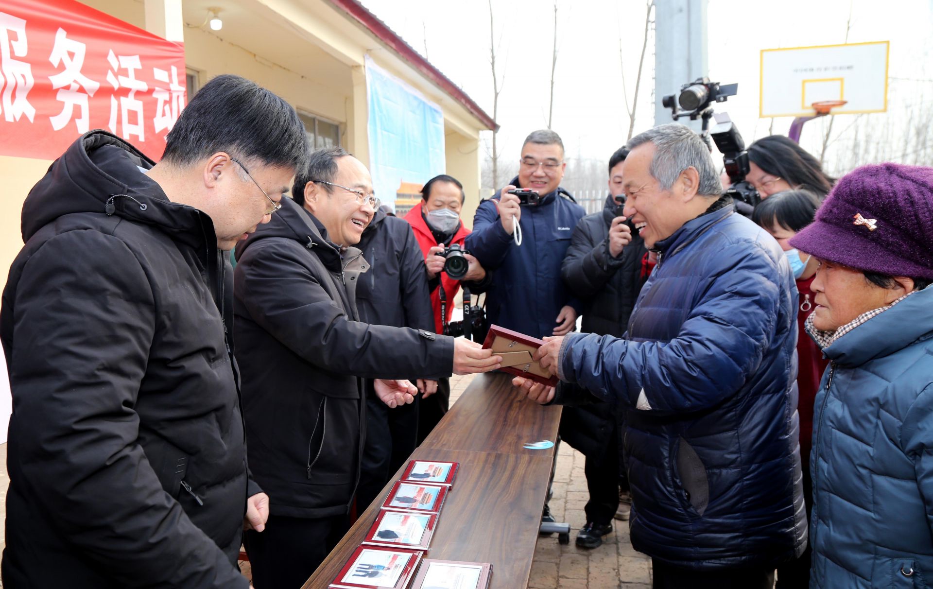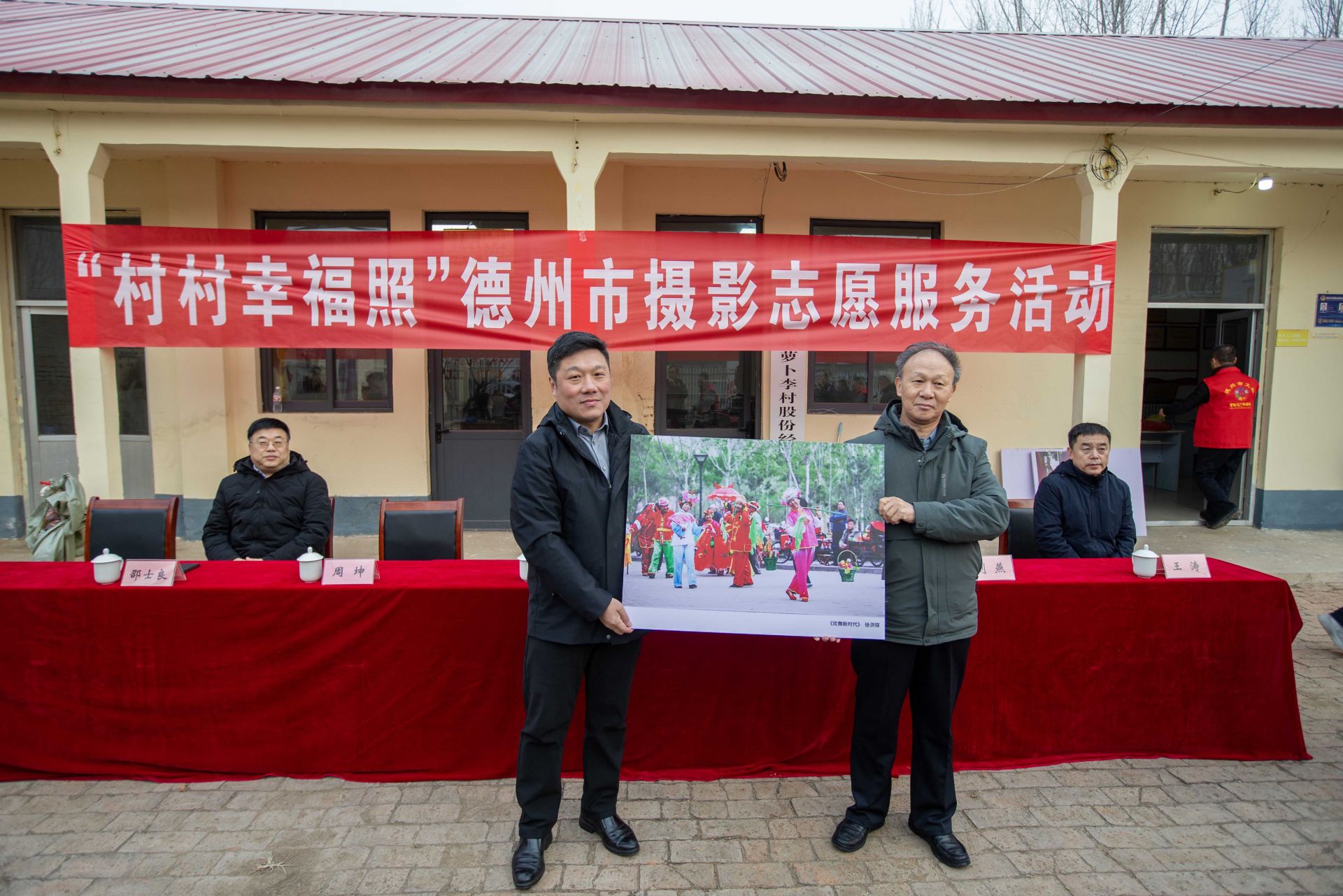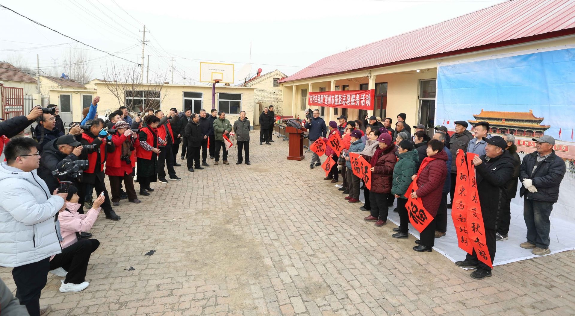 1月26日,农历腊月初八,德州市“情暖腊八·定格幸福”——“村村幸福照”志愿服务活动在天衢新区抬头寺镇水萝卜李村温情开启。本次活动由德州市文联、天衢新区党工委管委会主办,德州市摄影家协会、山东新华书店集团有限公司德州分公司、天衢新区党群工作部及抬头寺镇党委承办。德州市委宣传部副部长、市文联党组书记李文豪,山东新华书店集团有限公司德州分公司党委书记、总经理刘燕,德州市摄影家协会名誉主席刘新生,德州市摄影家协会主席周坤,天衢新区党群工作部副部长王涛,抬头寺镇党委书记、四级调研员邵士良,抬头寺镇党委副书记、镇长王彦出席活动。30余名摄影家与书法家走进基层,以文艺志愿服务的形式,为村民送上特别的新春礼物。