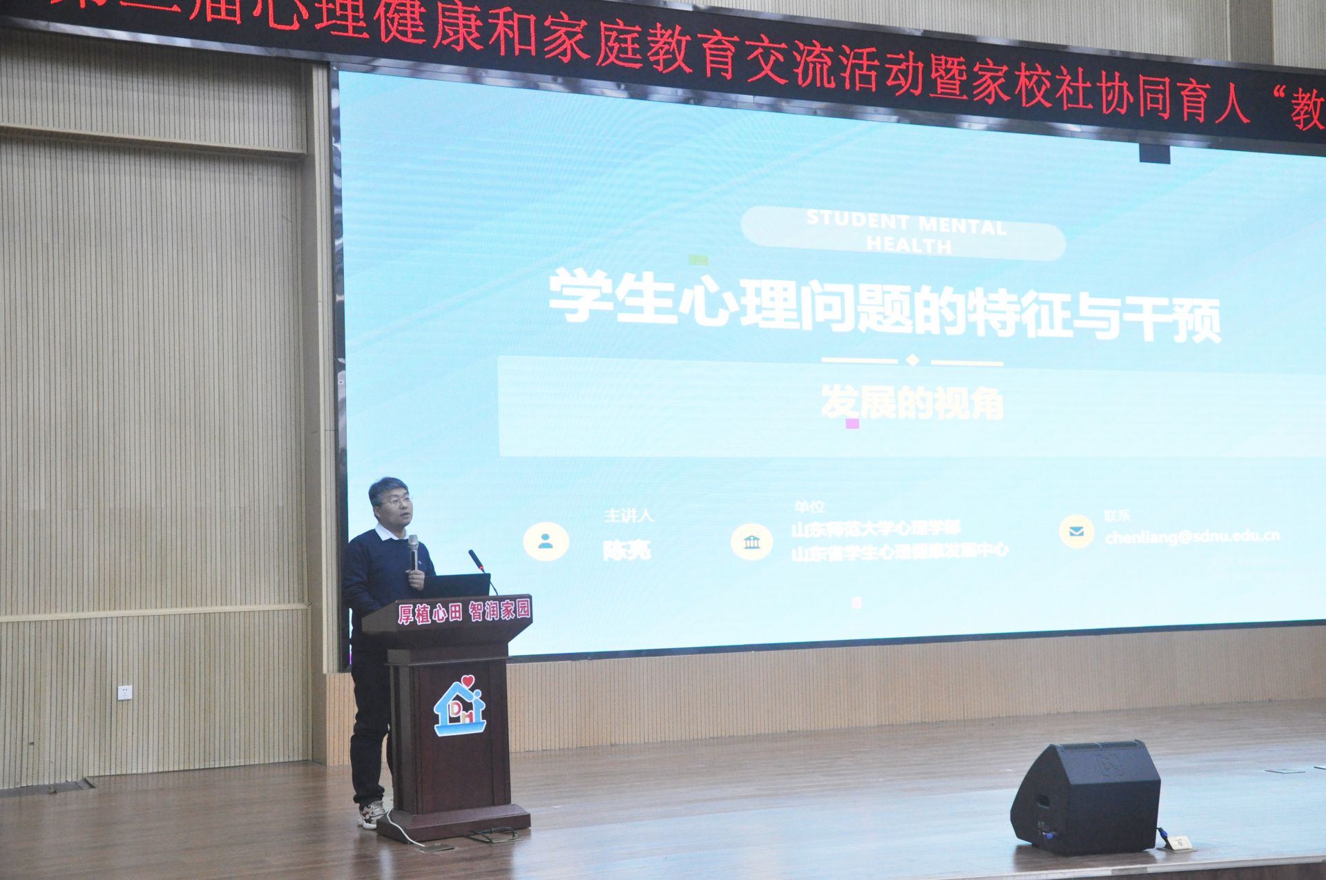 此次活动邀请了多位家长和教师代表分享育人故事。从家风熏陶、学生成长转变,到教师专业发展与幼小科学衔接,一个个真实而鲜活的案例引发了现场强烈共鸣。活动最后,山东师范大学教授陈亮与博士陈丽君分别围绕《学生心理问题的特征与干预:发展的视角》和《中小学教师心理健康维护》开展专题讲座,为与会人员提供了专业理论指导和实用策略支持,现场交流踊跃,气氛热烈。