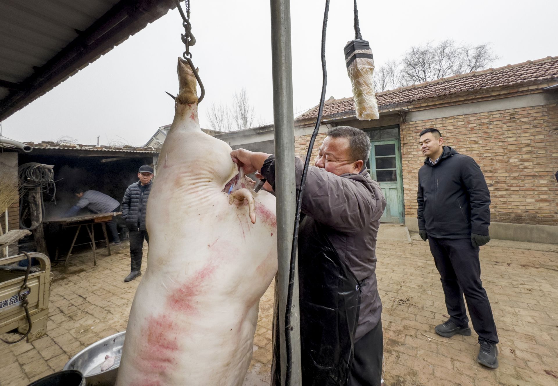 直播现场东侧,杀年猪的民俗活动正酣。“家人们看这土猪肉!肥瘦相间,热热闹闹多有年味儿!”李洋趁机将镜头转向案板,边直播边向直播间的人们介绍村里的民俗特色。
