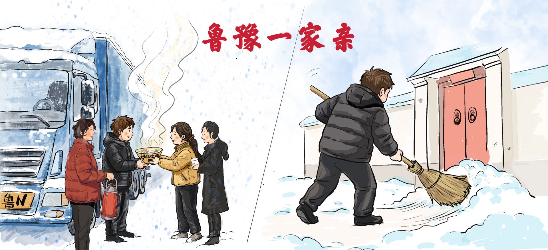 最近,山东德州货车司机王玉志与河南南召三姐妹的故事,温暖了全网。大雪封路,王玉志和货车被困,河南大姐直接把人带回家,端上一碗热气腾腾的羊肉炝锅面。倍受感动的王玉志先是扫雪答谢,回家后又拉了一车家乡特产,专程回河南“走亲戚”。一来一往,鲁豫两地人的善意实现双向奔赴。