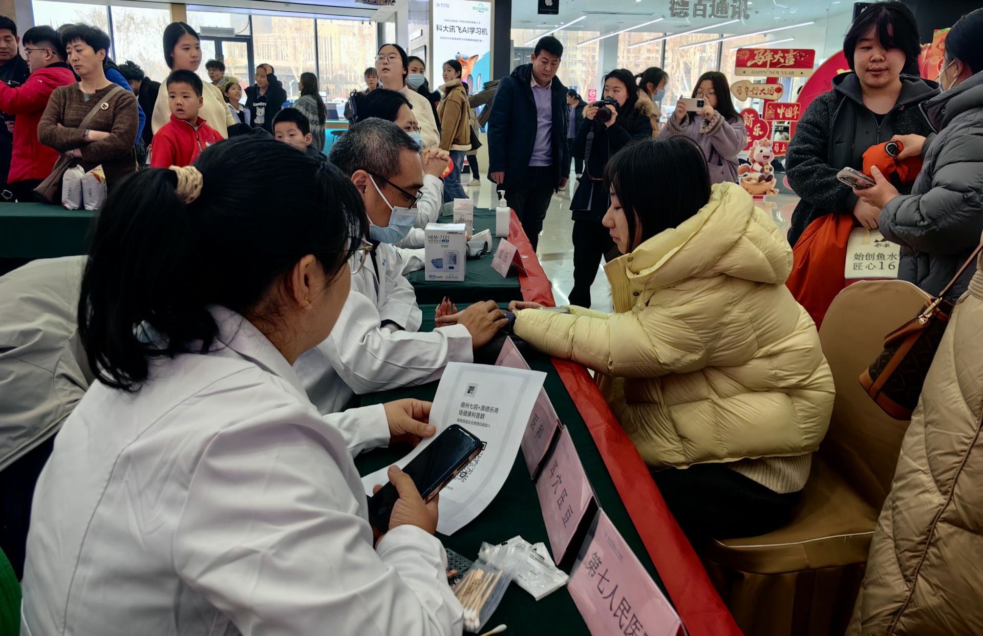 活动现场,文艺演出与文化市集同步展开。舞蹈《龙马精神》、民乐合奏《贺岁迎春》等节目轮番上演,引得观众掌声连连。与此同时,文化市集区成为人气焦点:12位书法家挥毫泼墨,为市民书写定制春联与“福”字,“骏马踏春行好运,少年立志展宏图”等联句饱含对新年的美好期许;非遗体验区中,市民在德州老年书画协会指导下亲手拓印“福”字扇子、学习新春剪纸技艺,感受传统文化的独特魅力;中医义诊区则由德州市第七人民医院的6名医师提供脉诊、养生指导等服务,并展示中医非遗特色疗法,吸引众多中老年市民驻足咨询。