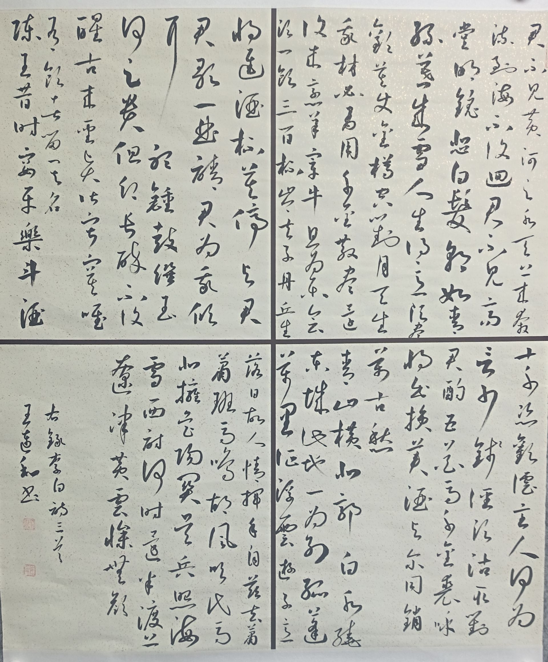 零基础学员李文池退休后,跟随王连和学习书法,学了3年,作品荣获第三届“当代文化愚公杯”全国中老年书画篆刻大赛铜奖。“只要学生想学,老师就耐着性子教,一遍不行就多来几遍。”李文池介绍,之所以能获奖,与老师传授的两个理念相关:其一,打破“心正则字正”的藩篱,不求一字一画的中正,而要实现整幅作品的浑然一体;其二,行草书书写速度不必求快,找准节奏,才能收放自如。“这些经验都是我走了很多弯路摸索出来的,对于没有书法基础的人来说,掌握正确方法,往往能进步神速。”王连和笑道。