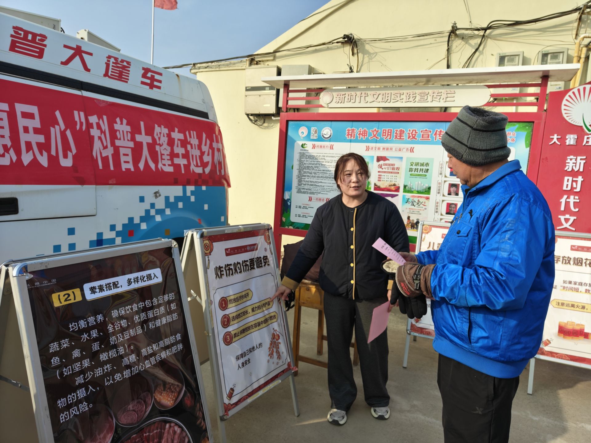 活动现场,科普大篷车成为乡村里的“科学打卡点”,围绕春节高频生活场景设置的科普展板格外吸睛。春节饮食健康展板前,村民们驻足细看,合理膳食搭配、节日饮食禁忌、食材保鲜技巧等实用知识,为大家的春节餐桌筑牢健康防线;烟花爆竹安全燃放展板区,图文并茂的讲解清晰标注了烟花爆竹选购、燃放规范、应急防护等要点,还特别针对老人、儿童等群体给出专属安全提示,让“安全过节”的理念深入人心,为新春团圆筑牢安全防线。工作人员还发放《冬季常见疾病预防知识》《春节假期公众健康提示》宣传页,现场详细讲解了冬季疾病预防和节日安全知识,把科学防护知识讲到大家心坎里。