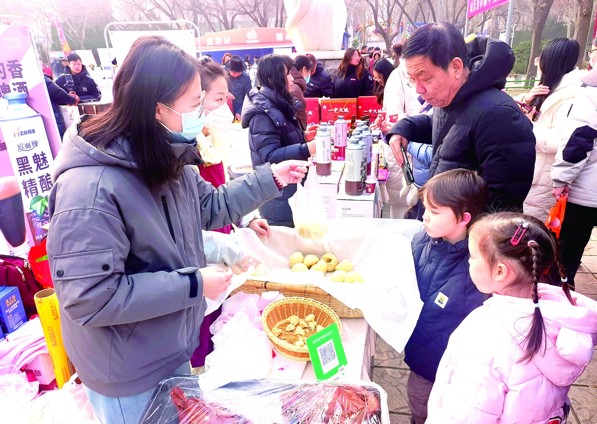 大集上,60家巾帼企业与“妇字号”商户携600余种好品集中亮相,涵盖健康食品、非遗文创、日常用品等。德州黑陶、德州窑红绿彩、建志剪纸等各展风姿,《马踏祥云》《马上有福》《骏跃纳福》……非遗传承人将传统技艺融入现代生活,设计出诸多马年主题作品,吸引市民前来挑选。食品年货摊位前,人气爆棚。德城区非遗项目传承人孙倩带来了形态多样的花馍,让年轻人爱不释手。“德州扒鸡、一中火腿、香椿酱、德平窝头、夏津椹果酒……都是咱德州特色名品。”市民刘宏明一早赶来,手里拎着各种各样的年货。