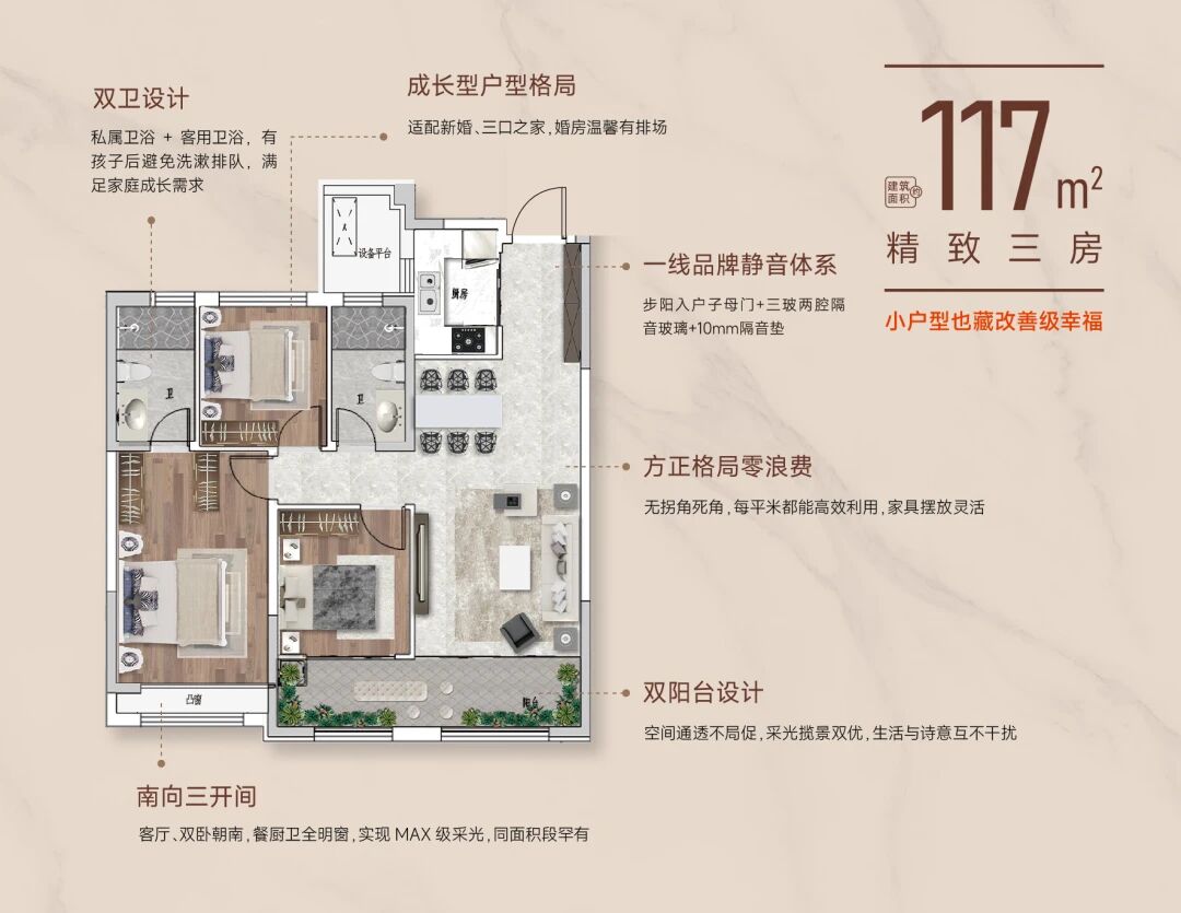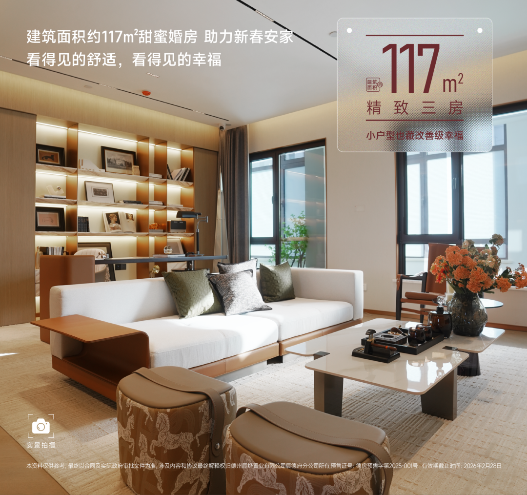 辰德府配套完善,园区已实景呈现,实现“所见即所得”。此次推出的117平方米三房,精准匹配新婚家庭需求,以紧凑格局承载二人世界温情。